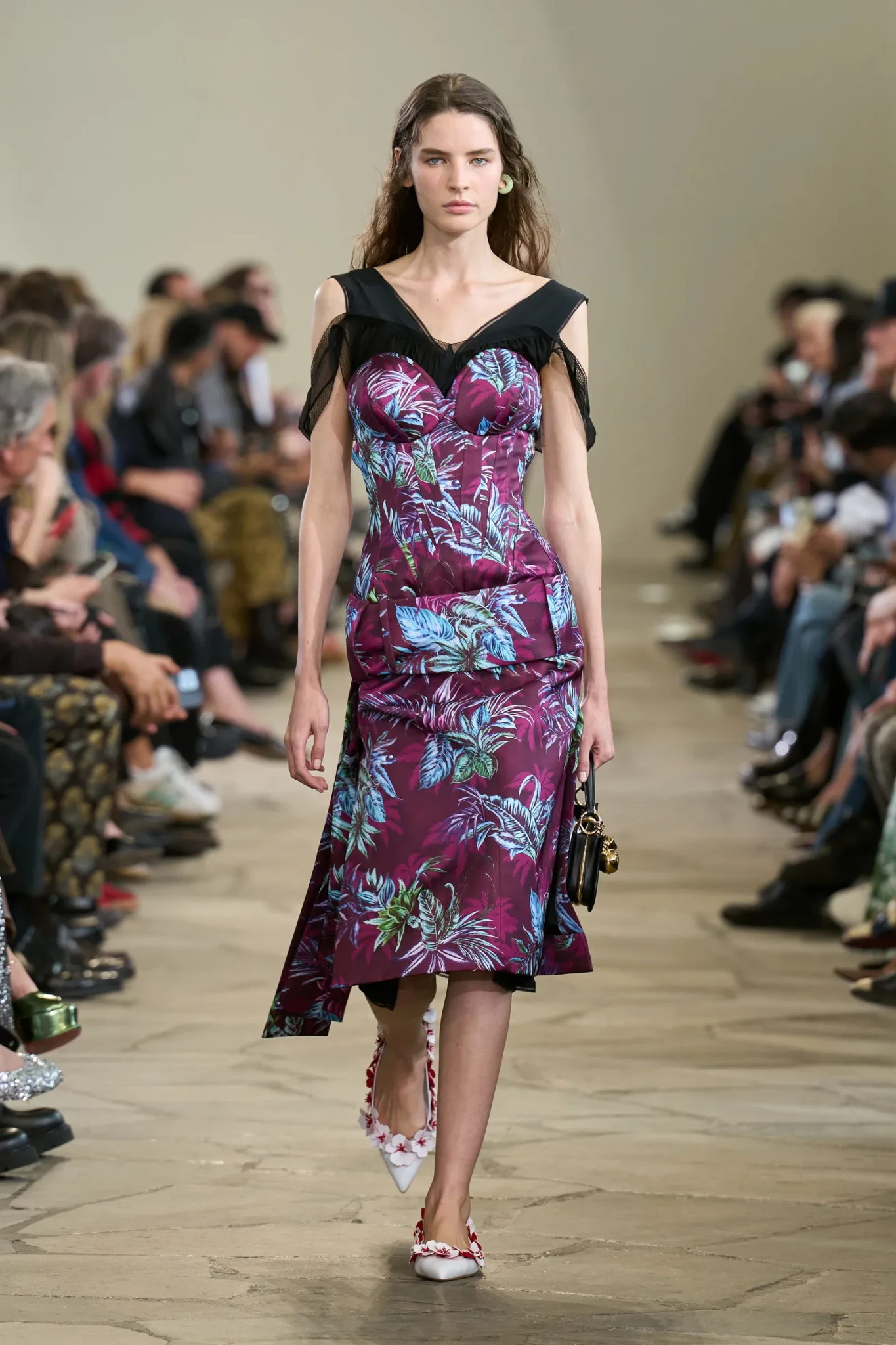 Στο εμβληματικό Centre Pompidou, ο Daniel Roseberry επέλεξε να παρουσιάσει τη νέα συλλογή του Schiaparelli υπό τον τίτλο “Dancer in the Dark”. Η επιλογή του χώρου δεν ήταν τυχαία. Ανάμεσα σε έργα τέχνης του 20ού αιώνα, το catwalk απέκτησε τη μορφή performance, με τους φωτισμούς να δημιουργούν μια ατμόσφαιρα χοροδράματος. Τα μοντέλα έμοιαζαν με χορευτές που εμφανίζονταν και χάνονταν στις σκιές, υπογραμμίζοντας τη διττή θεματική της συλλογής: φως και σκοτάδι, αποκάλυψη και απόκρυψη.