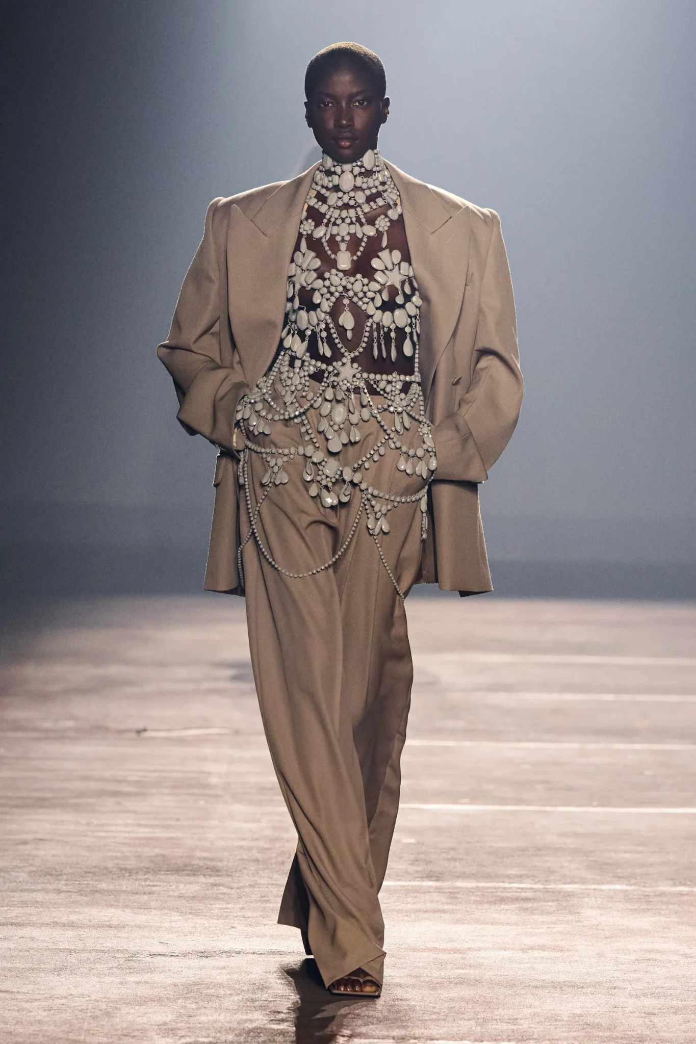 Η πρώτη prêt-à-porter συλλογή του Miguel Castro Freitas για τον Mugler ήταν ίσως η πιο πολυσυζητημένη στιγμή της ημέρας. Ο χώρος που επιλέχθηκε - ένα υπόγειο γκαράζ στο Παρίσι - απέδωσε άψογα την ιδέα της ωμής ενέργειας που χαρακτηρίζει τον οίκο. Χαμηλοτάβανο, μεταλλικό και ψυχρό, το σκηνικό έκανε το φως να αντανακλάται στα υλικά των ρούχων, δημιουργώντας μια ένταση ανάμεσα στη βιομηχανική ατμόσφαιρα και την glam λάμψη.