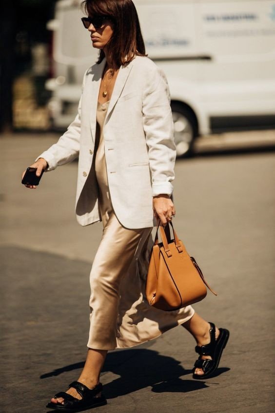 Φυσικά κι ένα ζευγάρι dad sandals μπορούν να σταθούν στα office looks. Μάλιστα, θα «παντρέψετε» δύο διαφορετικά στιλ, τα οποία στο τέλος θα δώσουν ένα άκρως αρμονικό αποτέλεσμα. Προτιμήστε ένα silk dress - τα μεταξωτά υφάσματα είναι ιδανικά για τις υψηλές θερμοκρασίες- μαζί με μία tote bag στην οποία θα μπορείτε να βάλετε περισσότερα από τα απαραίτητα. Σε περίπτωση που επιθυμείτε να κάνετε την εικόνα σας πιο fomal μπορείτε να προσθέστε ένα oversized blazer. Plus, ένα ζευγάρι γυαλιά ηλίου θα εντυπωσιάσει.