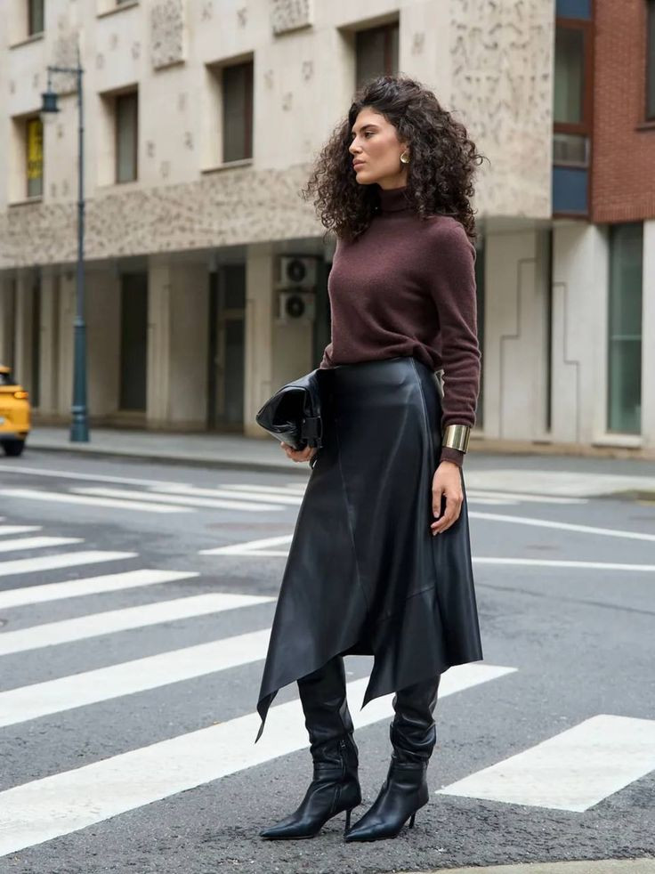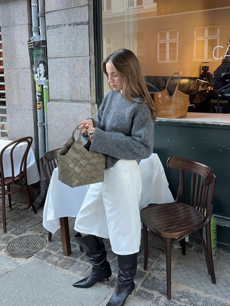Πολλοί θεωρούν πως οι ψηλές μπότες δεν συνδυάζονται με midi φούστες, όμως αυτό το look αποδεικνύει το αντίθετο. Ο συνδυασμός ριγέ και πουά μοτίβων προσθέτει μια πιο παιχνιδιάρικη και ενδιαφέρουσα διάθεση, ενώ οι κλασικές δερμάτινες μπότες ισορροπούν την εικόνα. Τις ημέρες με περισσότερο κρύο μπορείτε να ολοκληρώσετε την εικόνα σας με ένα πλεκτό cardigan για cozy και κομψό αποτέλεσμα.