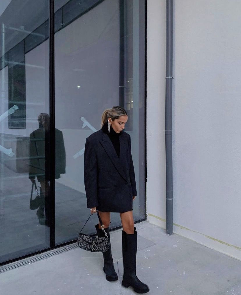 Το oversized blazer dress σε συνδυασμό με platform boots δημιουργεί μια δυναμική σιλουέτα με χαρακτήρα. Σε περίπτωση που ανήκετε στις τολμηρές και σας αρέσει να πειραματίζεστε με την εικόνα σας, αντί για μπότες μέχρι το γόνατο, μπορείτε να δοκιμάσετε και over-the-knee εκδοχές. Συνδυάστε με μια τσάντα με μεταλλικές λεπτομέρειες και κρίκους για ένα τολμηρό, fashion-forward αποτέλεσμα.