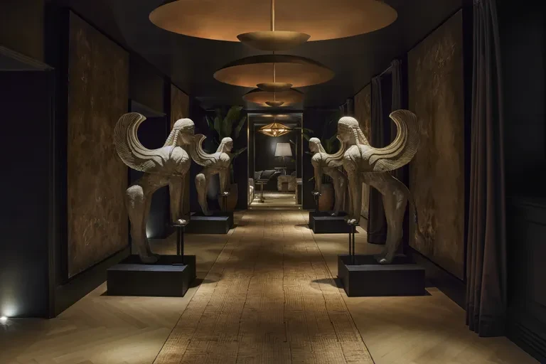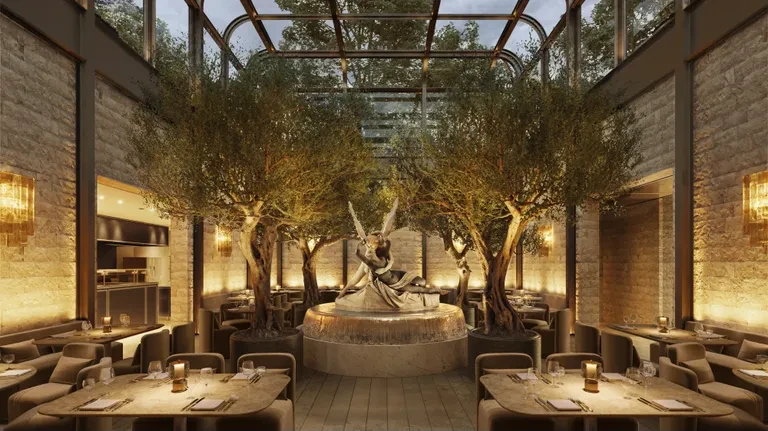 Οι υπόγειοι χώροι είναι αφιερωμένοι σε αυτό το εστιατόριο, επενδεδυμένοι με ασβεστόλιθο Crème de Moss, ενώ η ατμόσφαιρα αντλεί έμπνευση από την κλασική μυθολογία, με ανάγλυφα του Ιταλού γλύπτη Fabio Viale που φωτίζονται διακριτικά τη νύχτα. Σημείο αναφοράς αποτελεί η τραπεζαρία, όπου δεσπόζει ένας πολυέλαιος Barovier & Toso με 645 επιχρυσωμένους κρυστάλλους που μοιάζουν να καταρρέουν σαν καταρράκτης.