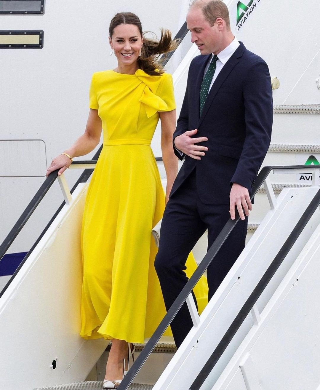 O William και η Kate έφτασαν στο Κίνγκστον στις 22 Μαρτίου 2022, στο δεύτερο σκέλος της περιοδείας τους στην Καραϊβική. Η Δούκισσα φορούσε ένα φόρεμα στην κίτρινη απόχρωση της σημαίας της Τζαμάικα, από τον οίκο Roksanda. Το look της ολοκληρώθηκε μ' ένα εντυπωσιακό καπέλο στο ίδιο φωτεινό χρώμα. Ξεκίνησαν από μια συνάντηση με τον Γενικό Κυβερνήτη της Τζαμάικα, Sir Patrick Allen, στην επίσημη κατοικία του, το King's House.