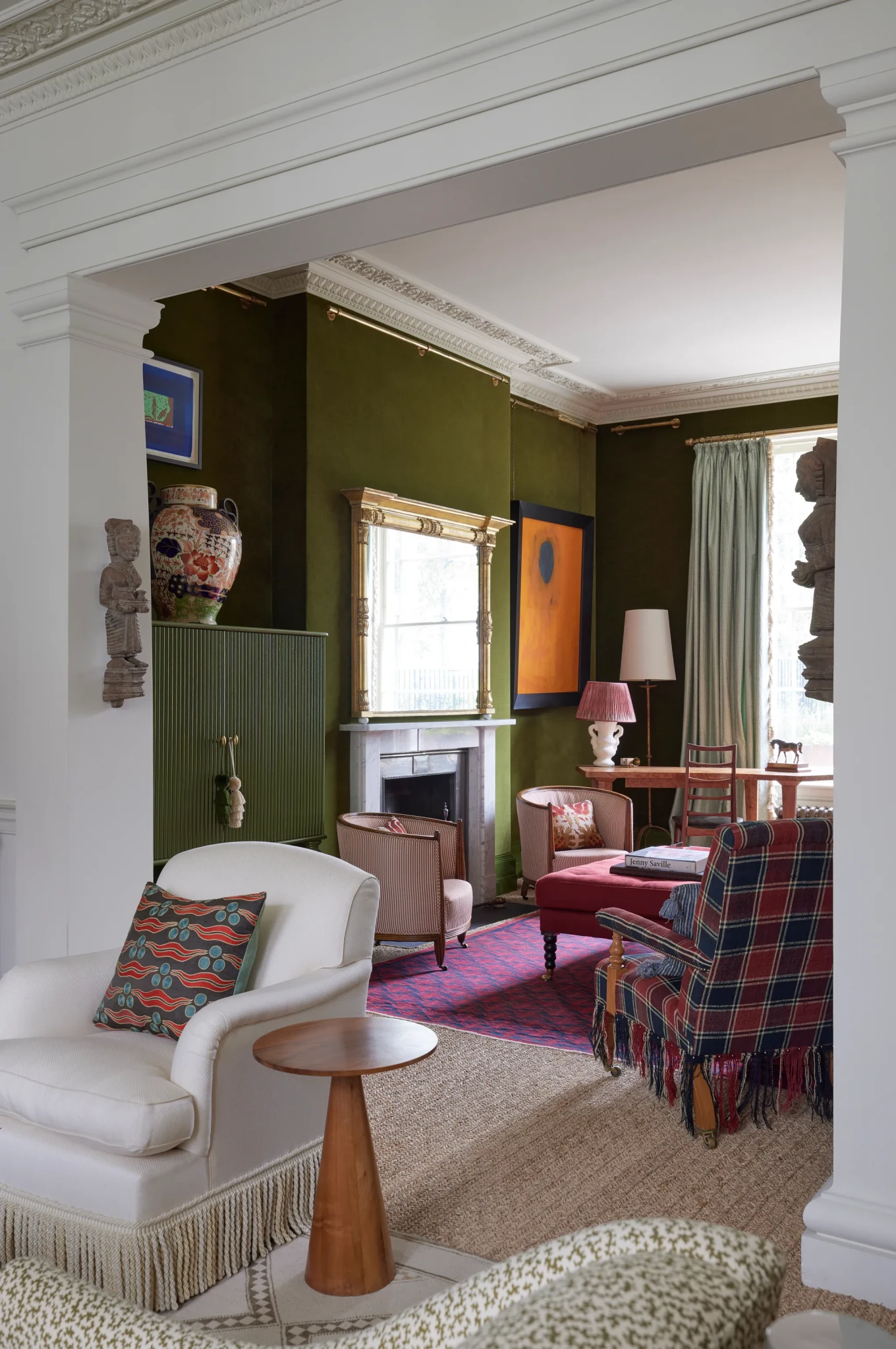 Το καθιστικό χαρακτηρίζεται από έναν custom χακί καναπέ που τοποθετείται πάνω σε ένα πλούσιο χαλί “Tangier”, ενισχύοντας την αίσθηση της οικειότητας και της άνεσης. Επίκεντρο στον χώρο αποτελεί ένας πολυέλαιος “Bronze Mask” από την Cox London, που προσθέτει μια νότα κομψότητας, δίνοντας το στοιχείο της γλυπτικής στο δωμάτιο. Συνοδευτικό αντικείμενο είναι ένας καθρέφτης “Bucranium” από Howe London και ένα πλαϊνό τραπεζάκι από καρυδιά του Rose Uniacke, στοιχεία που συνθέτουν μια εικόνα πλούσιας υφής και πολυεπίπεδης αισθητικής.