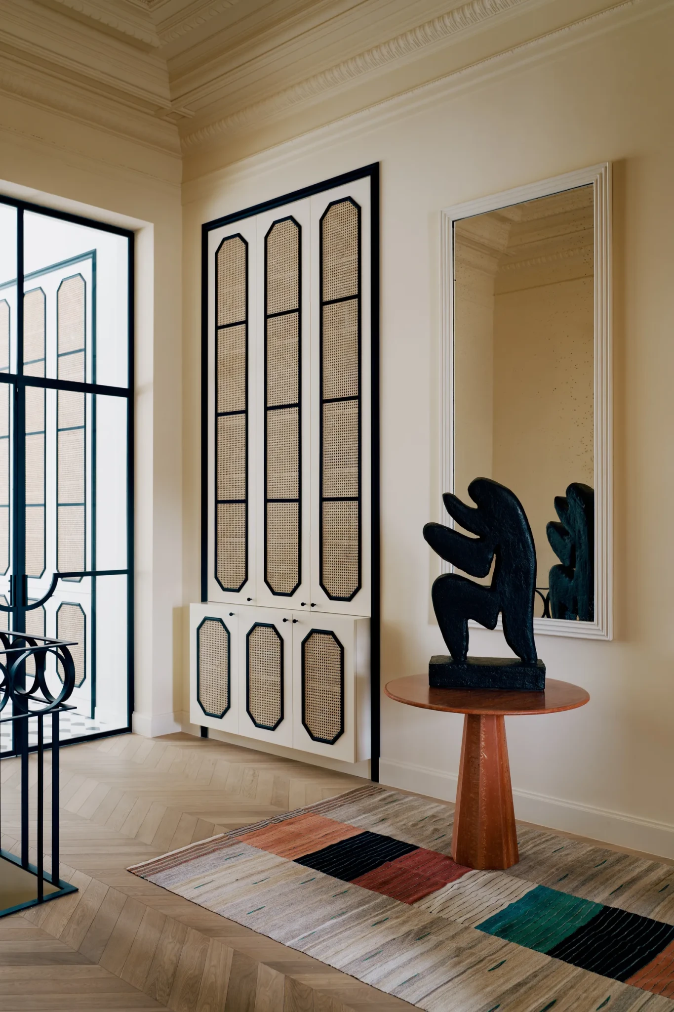 Στο κεντρικό σαλόνι, τα υλικά συνεχίζουν να εξισορροπούν μεταξύ παραδοσιακού και σύγχρονου. Τα λουστραρισμένα πλακάκια Bisazza στο πάτωμα της κουζίνας δίνουν μια παιχνιδιάρικη, γραφική νότα, ενώ ένα βιτρό Illumen φωτίζει το δωμάτιο με μια απαλή λάμψη. Παραστάσεις με τοιχογραφίες από την καλλιτέχνη Madeleine Schilling στολίζουν τις ντουλάπες και τις πόρτες του ανελκυστήρα, προσθέτοντας μια δημιουργική και απρόσμενη πινελιά σε έναν χώρο που ήδη ξεχειλίζει από προσωπικότητα.