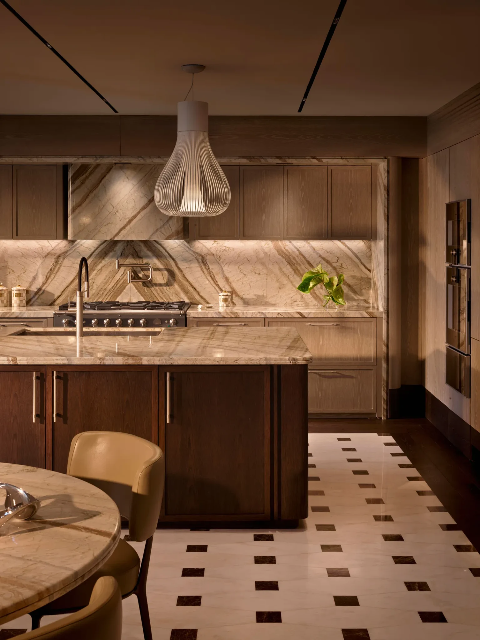 Η κουζίνα έχει σχεδιαστεί όχι ως αυτόνομος χώρος, αλλά ως φυσική προέκταση του καθιστικού. Οι αλλαγές υλικών είναι διακριτικές, καθώς βασίζονται περισσότερο στην υφή παρά στην αντίθεση. Τα φυσικά νερά της πέτρας στους πάγκους συνδέονται οπτικά με τα ξύλινα ντουλάπια, ενώ η επιλογή απαλών matt φινιρισμάτων εξασφαλίζει ένα περιβάλλον τόσο λειτουργικό όσο και ήρεμο.