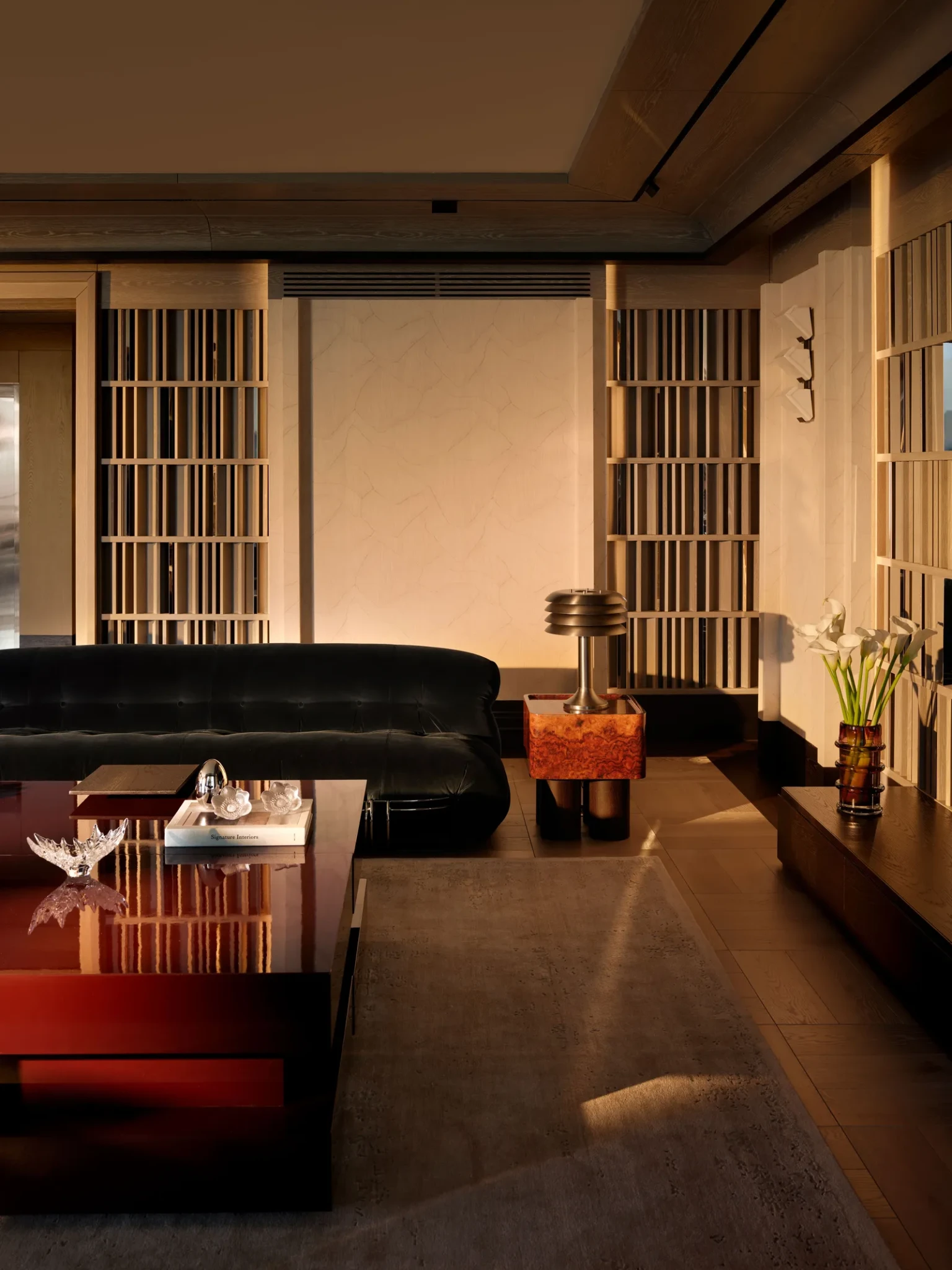 Καθώς ο χώρος μεταβαίνει προς την ιδιωτική πτέρυγα, ένας στενός διάδρομος με καμπυλωτούς, ξύλινους τοίχους υποδηλώνει την αλλαγή. Το ύφος γίνεται πιο προσωπικό και η αίσθηση του χώρου πιο ήρεμη και συγκρατημένη, δημιουργώντας μια φυσική μετάβαση ανάμεσα στο δημόσιο και ιδιωτικό.