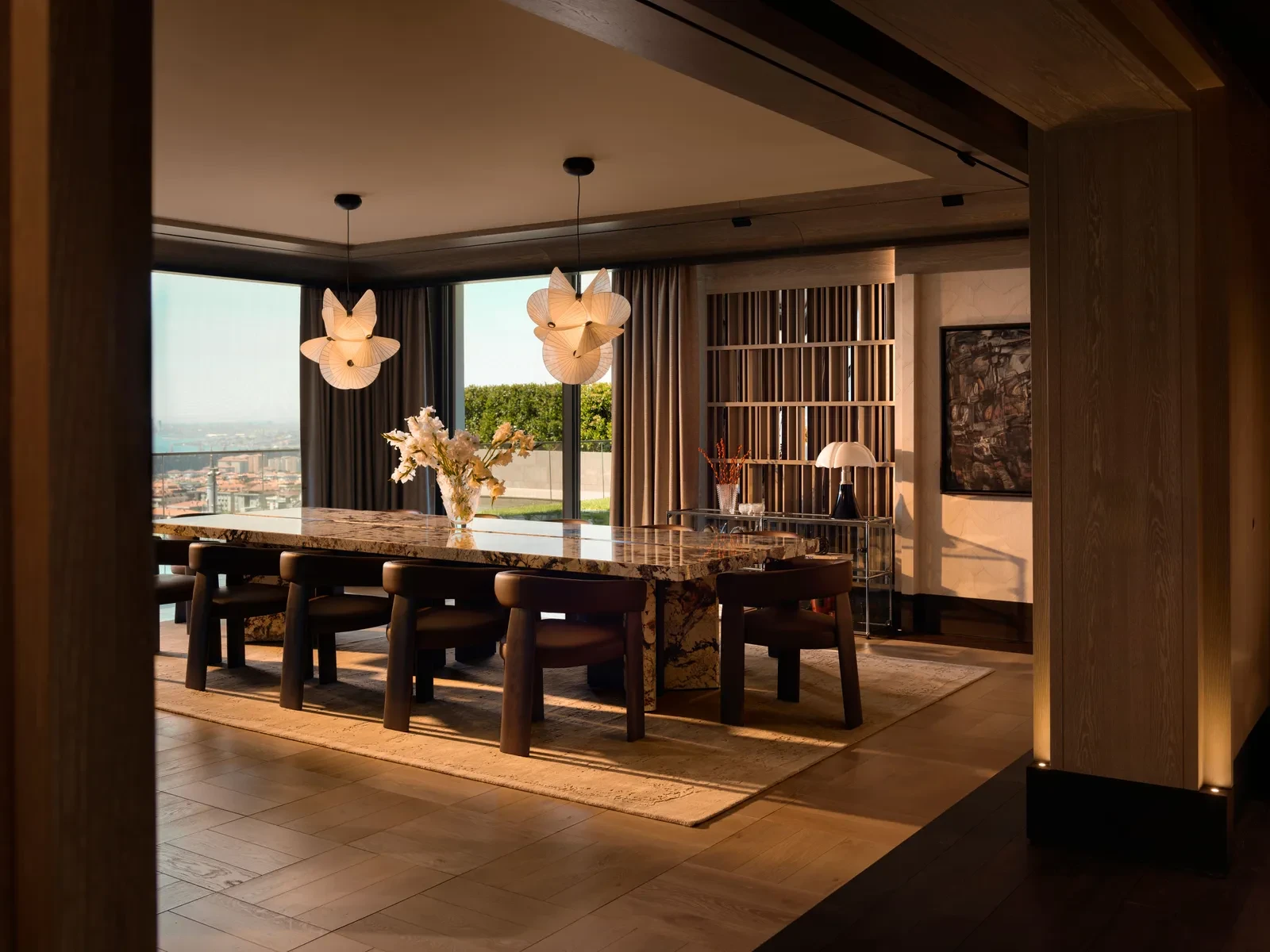 Tο τραπέζι της τραπεζαρίας και τα καθίσματα από φυσικό δέρμα μεταφέρουν την αίσθηση μιας χειροποίητης κομψότητας, ενώ τα φωτιστικά και τα καθίσματα από Ιταλούς και Ελβετούς σχεδιαστές εισάγουν λεπτές και ιστορικές νύξεις στο σύγχρονο σκηνικό. Αυτά τα στοιχεία εντάσσονται στη συνολική ηρεμία του χώρου και την συμπληρώσουν χωρίς υπερβολές.