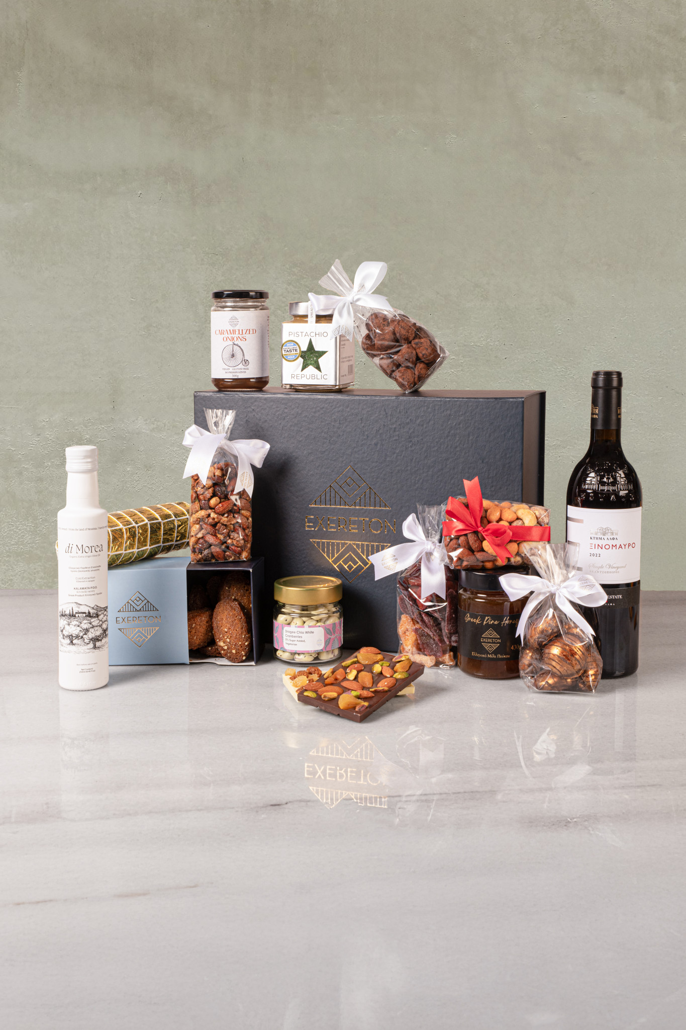 Όταν η γεύση συναντά την αισθητική και τη φροντίδα και όλα τα παραπάνω αποτυπώνονται σε ένα κουτί, τότε δημιουργούνται τα EXERETONGift Boxes που αποτελούν μια ολοκληρωμένη εμπειρία δώρου με premium χαρακτήρα. Γεμάτα με χειροποίητες, signature δημιουργίες, εμπνευσμένες από τη μεσογειακή διατροφή και την ελληνική γαστρονομία, συνδυάζουν την πλούσια γεύση με την εξαιρετική ποιότητα και την υψηλή θρεπτική αξία. Ένα πλούσιο δώρο ιδανικό για συνεργάτες, φίλους ή αγαπημένα πρόσωπα.