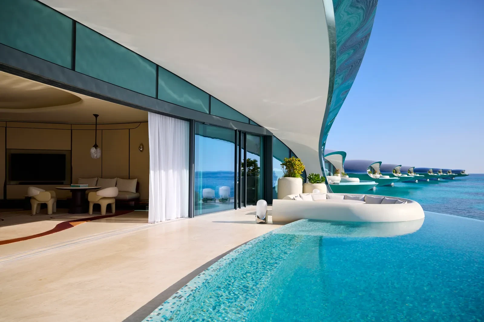 Στην καρδιά του Red Sea Project, το Shebara Resort αναδεικνύεται ως η απάντηση της Σαουδικής Αραβίας στις πολυτελείς βίλες πάνω από το νερό των Μαλδίβων. Με 73 μοναδικές βίλες σχεδιασμένες να μοιάζουν με λαμπερά μαργαριτάρια, το θέρετρο ενσωματώνει μια ριζοσπαστική αρχιτεκτονική που τιμά και προστατεύει το εύθραυστο θαλάσσιο περιβάλλον. Οι 38 βίλες που δεσπόζουν πάνω από τα κρυστάλλινα νερά στηρίζονται σε λεπτούς στύλους για ελάχιστη αναστάτωση στον βυθό, ενώ τα ατσάλινα πάνελ τους αντανακλούν το φως του ήλιου και «σβήνουν» με τα χρώματα της θάλασσας, προσφέροντας μια μοναδική αίσθηση αρμονίας με το φυσικό περιβάλλον.
