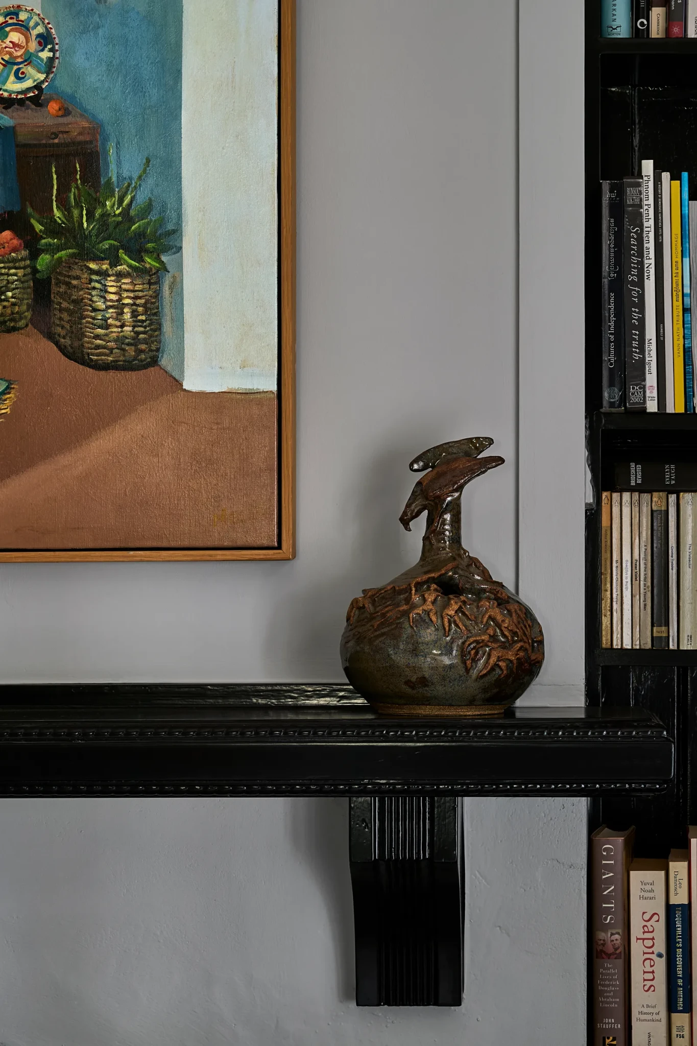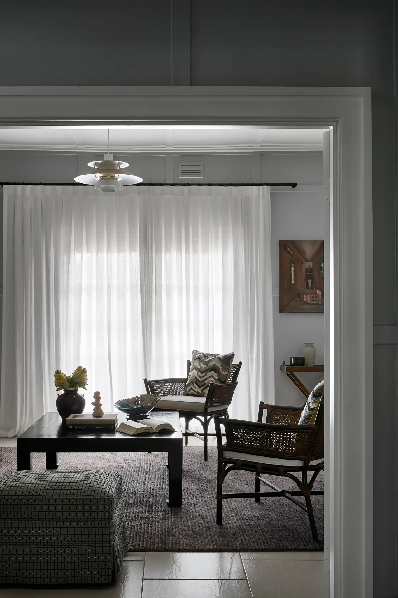 Οι ιδιοκτήτες ήθελαν ένα σπίτι που να εκφράζει την επαγγελματική και προσωπική τους ιστορία μέσα από αντικείμενα που συγκέντρωσαν από τα ταξίδια τους σε όλο τον κόσμο. Το αποτέλεσμα είναι μια αρμονική σύνθεση από αντίκες, ασιατικά στοιχεία, mid-century έπιπλα και custom κατασκευές. Κάθε δωμάτιο μοιάζει να αφηγείται την δική του ιστορία, μέσα από προσεκτικά επιλεγμένα κομμάτια, όπως οι Javanese ψάθινες καρέκλες στο σαλόνι και οι bespoke καναπέδες με βελούδινη επένδυση από Dedar.
