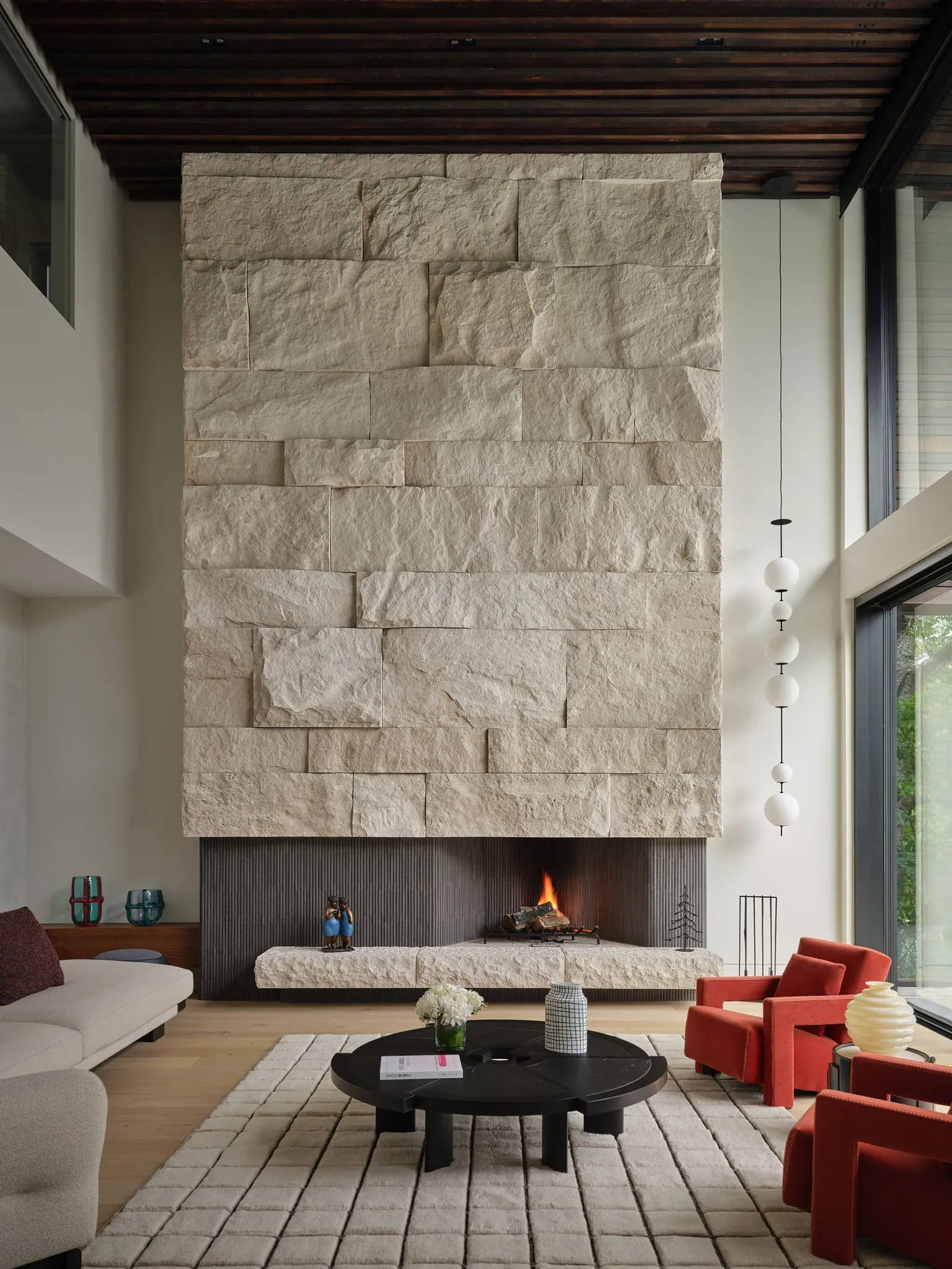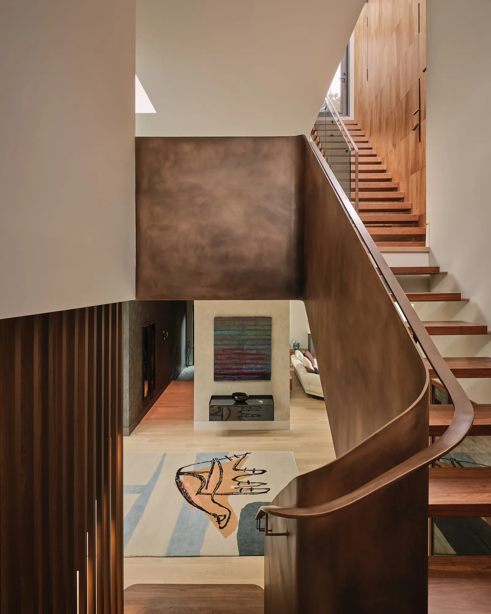Η επίπλωση και τα αντικείμενα επιλέχθηκαν για τις οργανικές τους φόρμες και τους βαθιούς χρωματικούς τόνους: αφηρημένα χαλιά της Cassina, πολυθρόνες Utrecht σε σκουριά κόκκινο, ένα μοναδικό ξύλινο παγκάκι και ένα αιωρούμενο φωτιστικό Elementi που πλαισιώνει το μνημειακό τζάκι. Το τελευταίο αποτελεί την πιο εντυπωσιακή στιγμή του σπιτιού, με επένδυση από σχισμένη πέτρα που παραπέμπει στα τοπία της Ιερουσαλήμ και της Χάιφα. Η σκάλα από οξειδωμένο ατσάλι συνεχίζει τη γλώσσα της εξωτερικής αρχιτεκτονικής, με ενσωματωμένα LED να δημιουργούν παιχνίδια φωτός και σκιάς στον χώρο της τραπεζαρίας. Κεντρικό ρόλο στο εσωτερικό παίζει και η καρυδιά, η οποία εμφανίζεται στα πατήματα της σκάλας, στα ειδικά κατασκευασμένα ντουλάπια της κουζίνας, σε συνδυασμό με μπρούντζο και πορσελάνη, αλλά και σε έναν διακοσμητικό τοίχο με μοτίβο που θυμίζει παζλ.