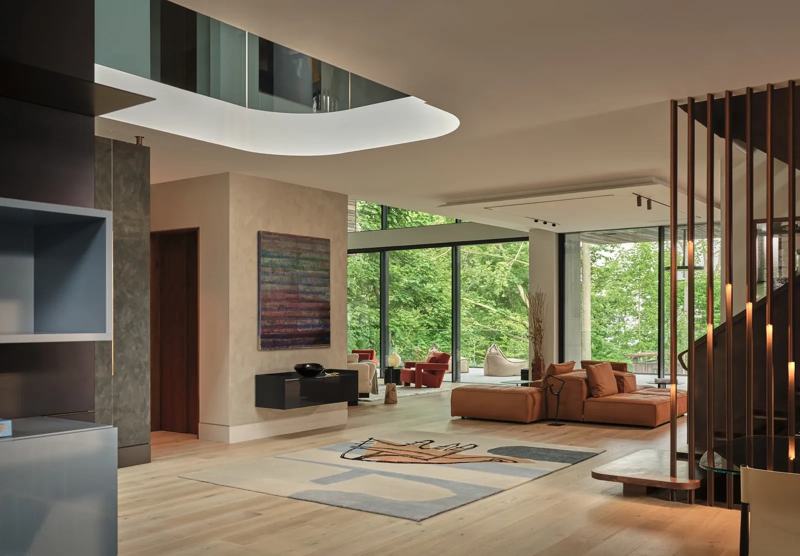 Στο εσωτερικό, οι χώροι αποκτούν τη δική τους γλυπτική έκφραση, με μια αίσθηση ανοιχτότητας που παραπέμπει έμμεσα σε θολωτές οροφές της Μέσης Ανατολής. Το δάπεδο της εισόδου, όπου μαύρο μάρμαρο Sahara Noir ενσωματώνεται σε σανίδες δρυός, λειτουργεί ως ανάμνηση της προγονικής εστίας. Ο ενιαίος χώρος καθιστικού προσφέρει μια εμπειρία χαλάρωσης που αγκαλιάζει τον επισκέπτη, με επίκεντρο έναν καναπέ Extrasoft της Living Divani, επενδυμένο με φυσικό δέρμα, σχεδιασμένο να «ανοίγεται» προς το τζάκι, την κουζίνα και τη λίμνη.