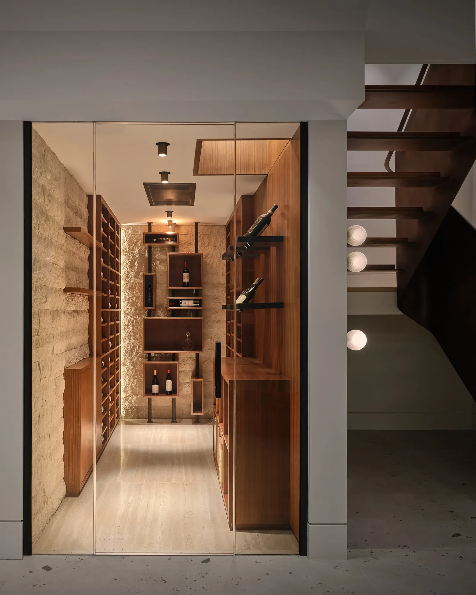 Η αίσθηση ευεξίας διαπερνά ολόκληρη την κατοικία. Τα μπάνια θυμίζουν ιδιωτικά spa, με φωτισμό χρωματοθεραπείας, ενώ στον κάτω όροφο αναπτύσσεται ένας πλήρης χώρος ευεξίας αφιερωμένος στις αισθήσεις του νερού, του φωτός και της πέτρας. Στο ίδιο επίπεδο βρίσκεται και η κάβα κρασιών, όπου ράφια από καρυδιά αναδεικνύουν πολύτιμες ετικέτες μπροστά σε τοίχους από ασβεστόλιθο. Πρόκειται για έναν χώρο βαθιά συναισθηματικό, καθώς χρησιμοποιείται το ίδιο είδος πέτρας που θυμίζει στους ιδιοκτήτες το σπίτι της παιδικής τους ηλικίας. Οι επιφάνειες μοιάζουν «δουλεμένες» από τον χρόνο, φορτισμένες με μνήμη και αυθεντικότητα, προσδίδοντας στο σπίτι βάθος, χαρακτήρα και μια σιωπηλή, αλλά έντονα αισθητή, ιστορία.