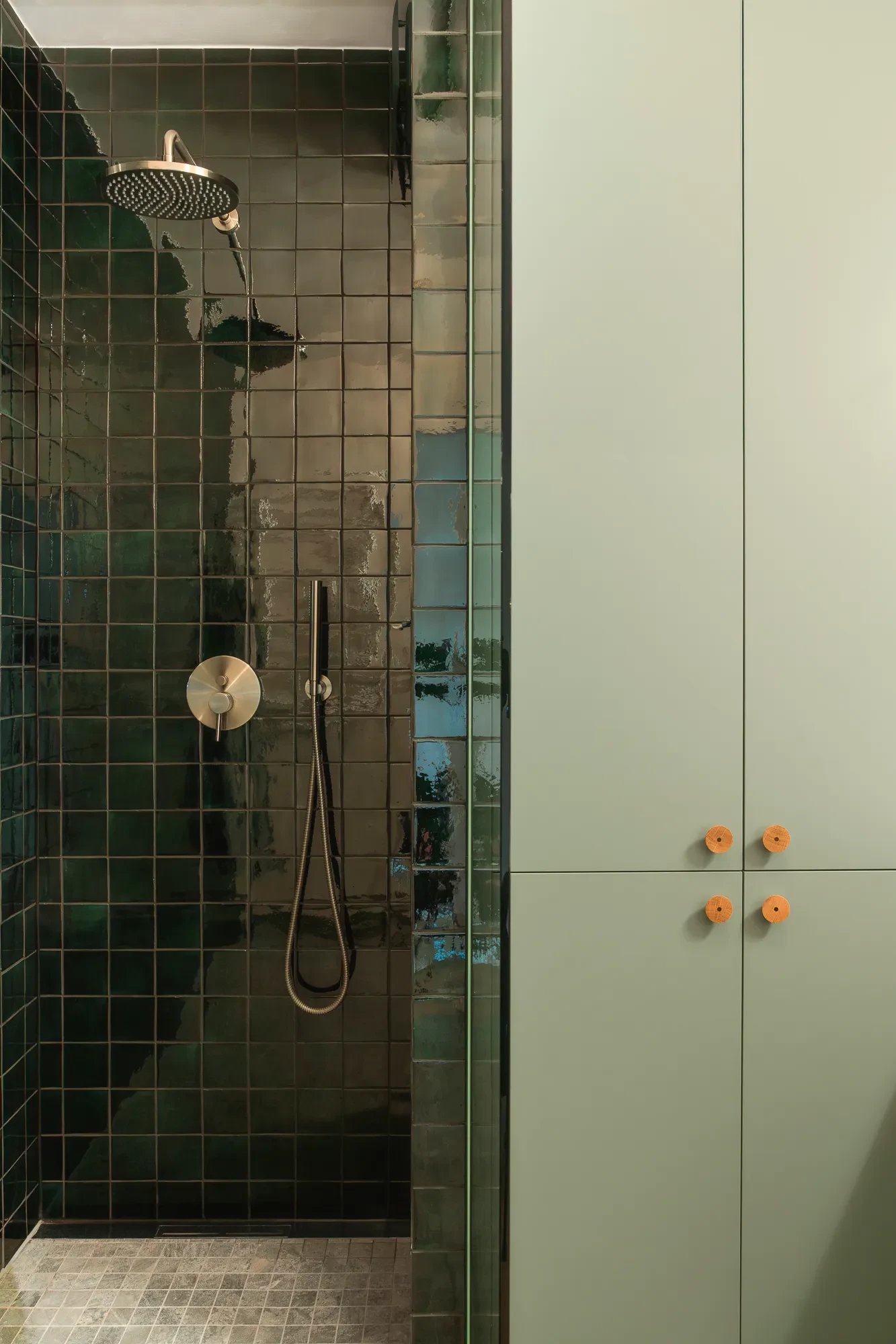 Στην είσοδο του διαμερίσματος υπάρχει ένα χειροποίητο μαροκινό χαλί σε απαλή πράσινη απόχρωση και ένας ενσωματωμένος πάγκος με βελούδινη υφή, δύο λεπτομέρειες που δημιουργούν αμέσως μια ζεστή και φιλόξενη ατμόσφαιρα. Αυτό το πράσινο μοτίβο επανέρχεται και σε άλλα σημεία του χώρου, συνδέοντας τις λειτουργικές ζώνες με μια συνεκτική χρωματική αφήγηση. Η επιλογή του χρώματος και των υφών εμπνέεται εν μέρει από τη μεσογειακή αισθητική που αγαπά η ιδιοκτήτρια. Εικόνες από χρυσές αποχρώσεις και ζεστά ηλιοβασιλέματα που μεταφράζονται μέσα από γήινους τόνους και πλακάκια φτιαγμένα στο χέρι. Αυτά τα στοιχεία, σε συνδυασμό με τις επιφάνειες από φυσικό ξύλο, δίνουν στην είσοδο και στους κοινόχρηστους χώρους μια αίσθηση ζωντάνιας και βάθους.