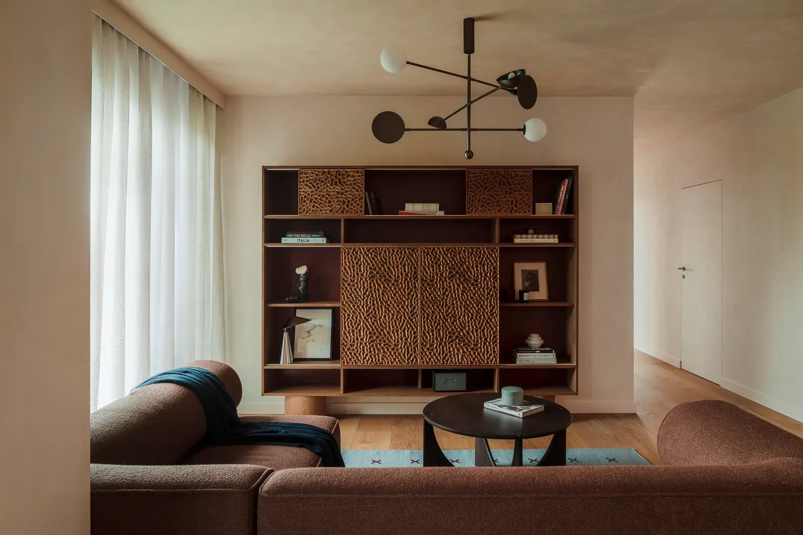 Το σαλόνι συμπληρώνει τον ενιαίο χώρο και χαρακτηρίζεται από έναν καναπέ modular σε σκούρο καφέ bouclé ύφασμα και ένα χειροποίητο χαλί σε απόχρωση Cross Blue/Burgundy, τα οποία ενισχύουν την αίσθηση ζεστασιάς και συνοχής από χρώματα και υλικά.