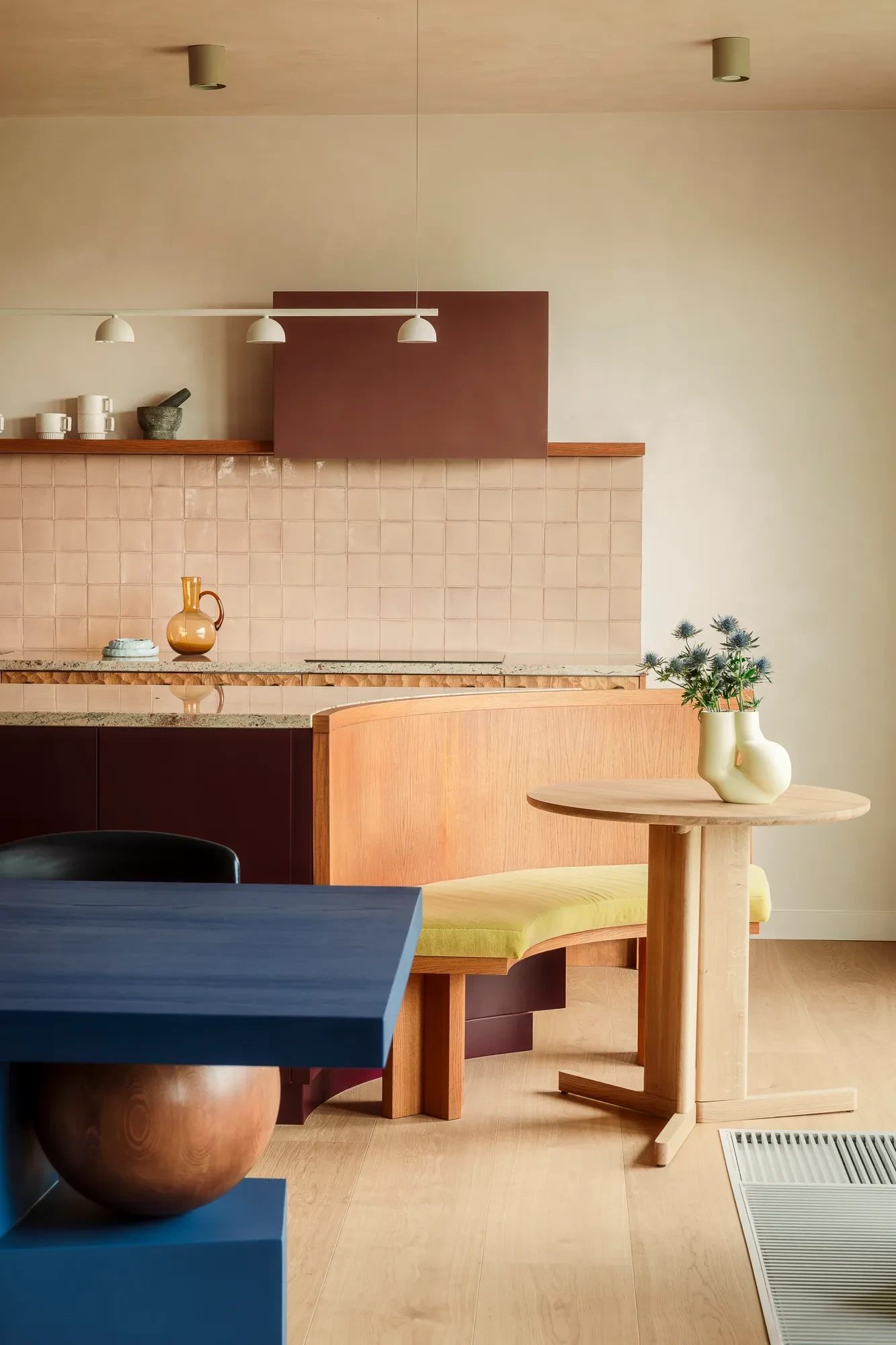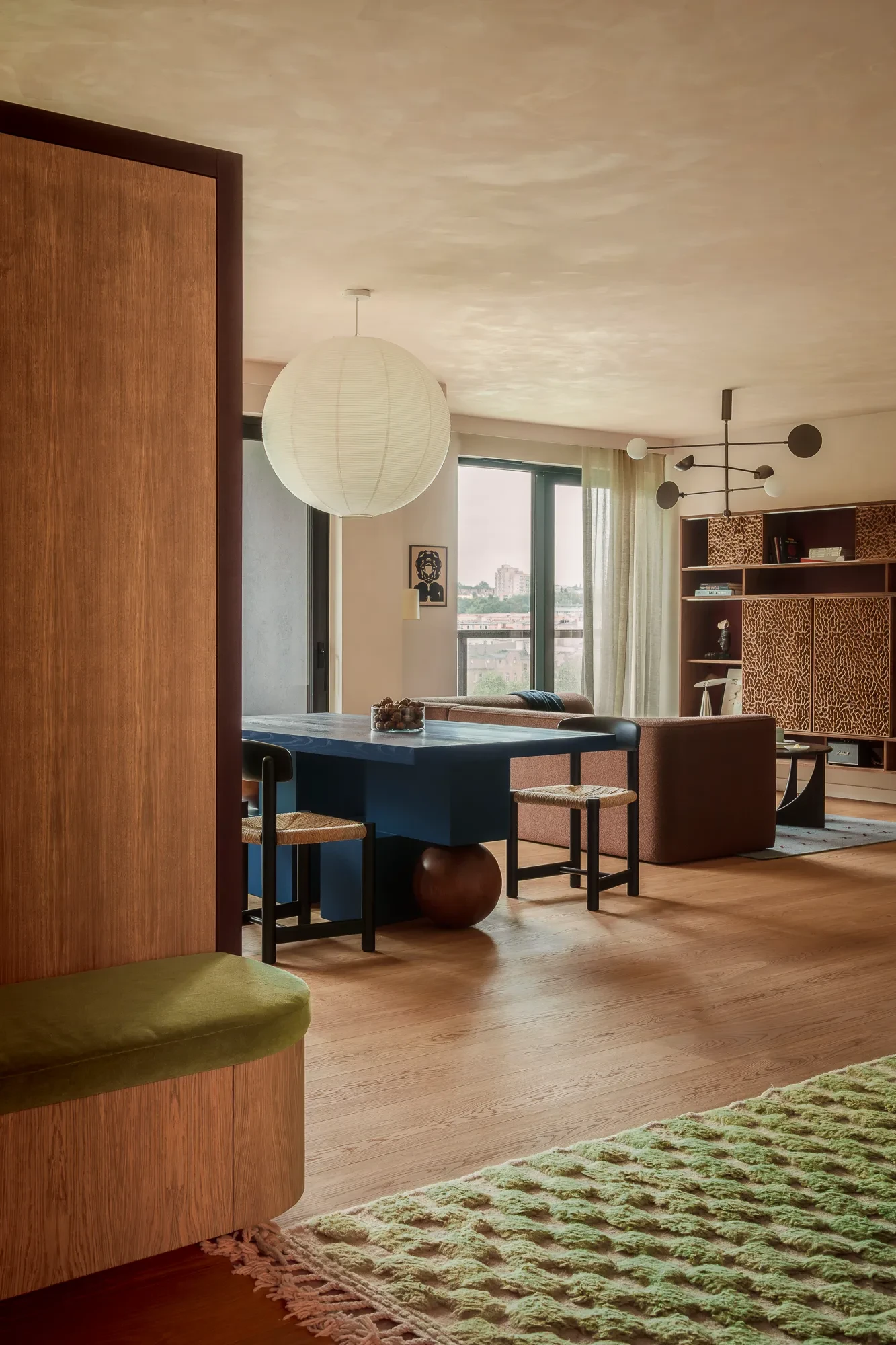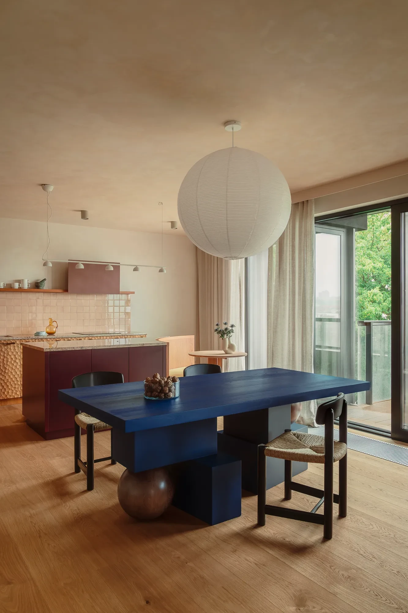 Η τραπεζαρία κοσμείται από ένα εντυπωσιακό ξύλινο τραπέζι από φράξο, μια σχεδιαστική πρόταση που θυμίζει γλυπτό, με έντονες γεωμετρικές γραμμές που «σπάνε» την αυστηρότητα και φέρνουν το στοιχείο του παιχνιδιού στην αισθητική του σπιτιού. Το ιδιαίτερο μπλε χρώμα του τραπεζιού δημιουργεί μια εξαιρετική αντίθεση στην παλέτα του χώρου, ενώ οι καρέκλες Daumiller από Gubi με τις πλεκτές θέσεις ενισχύουν τόσο την άνεση όσο και την υφή στον χώρο. Το στρόγγυλο κρεμαστό φωτιστικό είναι σχεδιασμένο από τον Isamu Noguchi για τη Vitra.