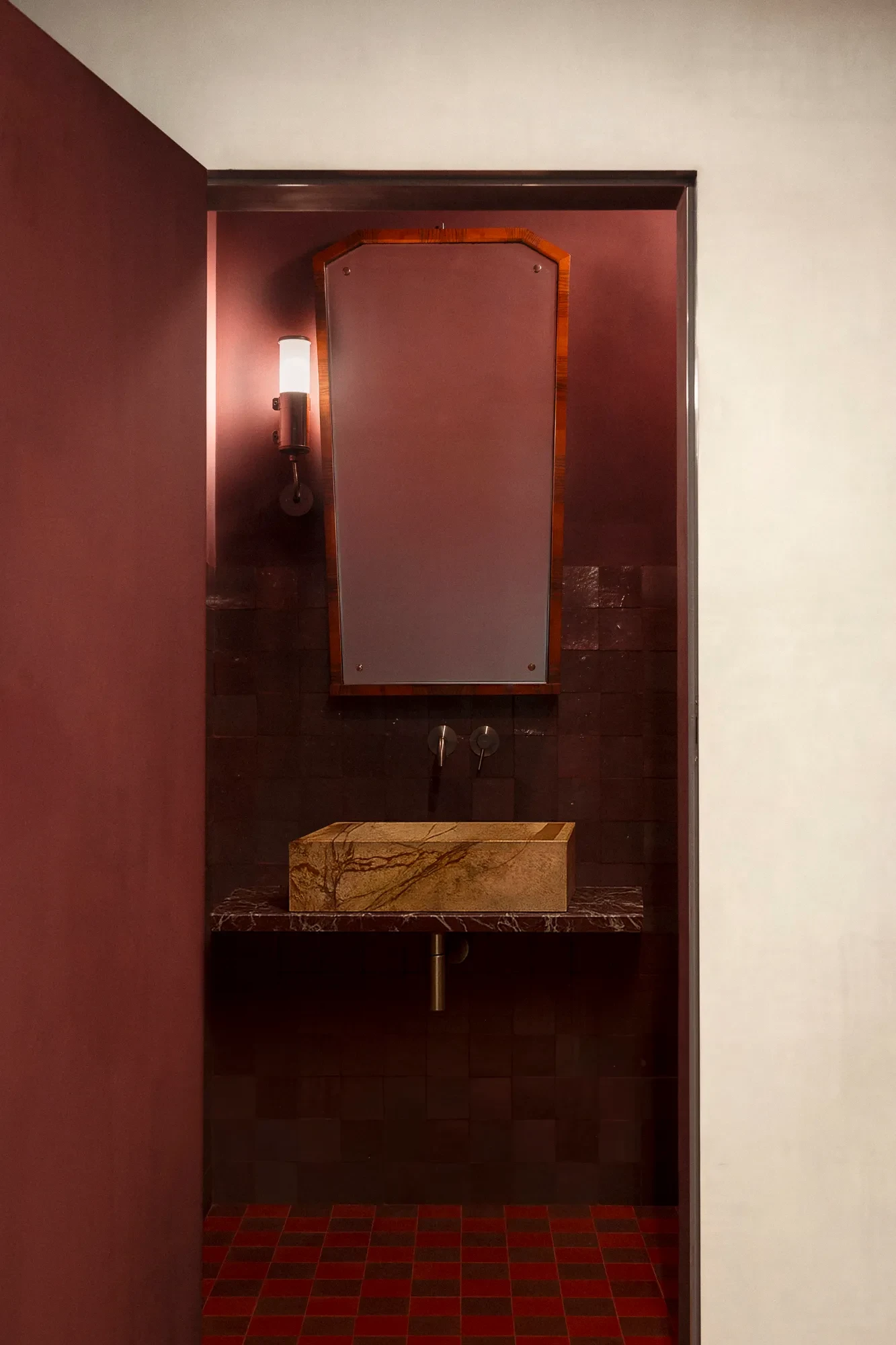 Τα δύο μπάνια φέρουν έντονο χρωματικό χαρακτήρα με τα ιδιαίτερα πλακάκια να πρωταγωνιστούν από το κέντρο των τοίχων ως το πάτωμα. Το πρώτο μπάνιο διαμορφώνεται σε πράσινες αποχρώσεις με λαμπερά πλακίδια στον χώρο της ντουζιέρας, τα οποία συνδυάζονται αρμονικά με τα ξύλινα έπιπλα και τα μεταλλικά στοιχεία. Το δεύτερο μπάνιο κατακλύζεται από τόνους μπορντό, βαθύ κόκκινο και έντονα χρώματα που δημιουργούν μια δραματική αλλά ισορροπημένη ατμόσφαιρα.