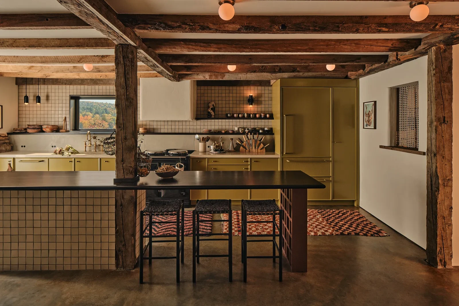 Σχεδιασμένη για να φιλοξενεί μεγάλες παρέες, η κουζίνα είναι το επίκεντρο της καθημερινής ζωής. Διαθέτει ντουλάπια σε μια ιδιαίτερη γήινη απόχρωση που οι designers αποκαλούν «creepy green», εμπνευσμένη από τα δάση του Vermont, τα οποία και φαίνονται από το παράθυρο πάνω του νεροχύτη.