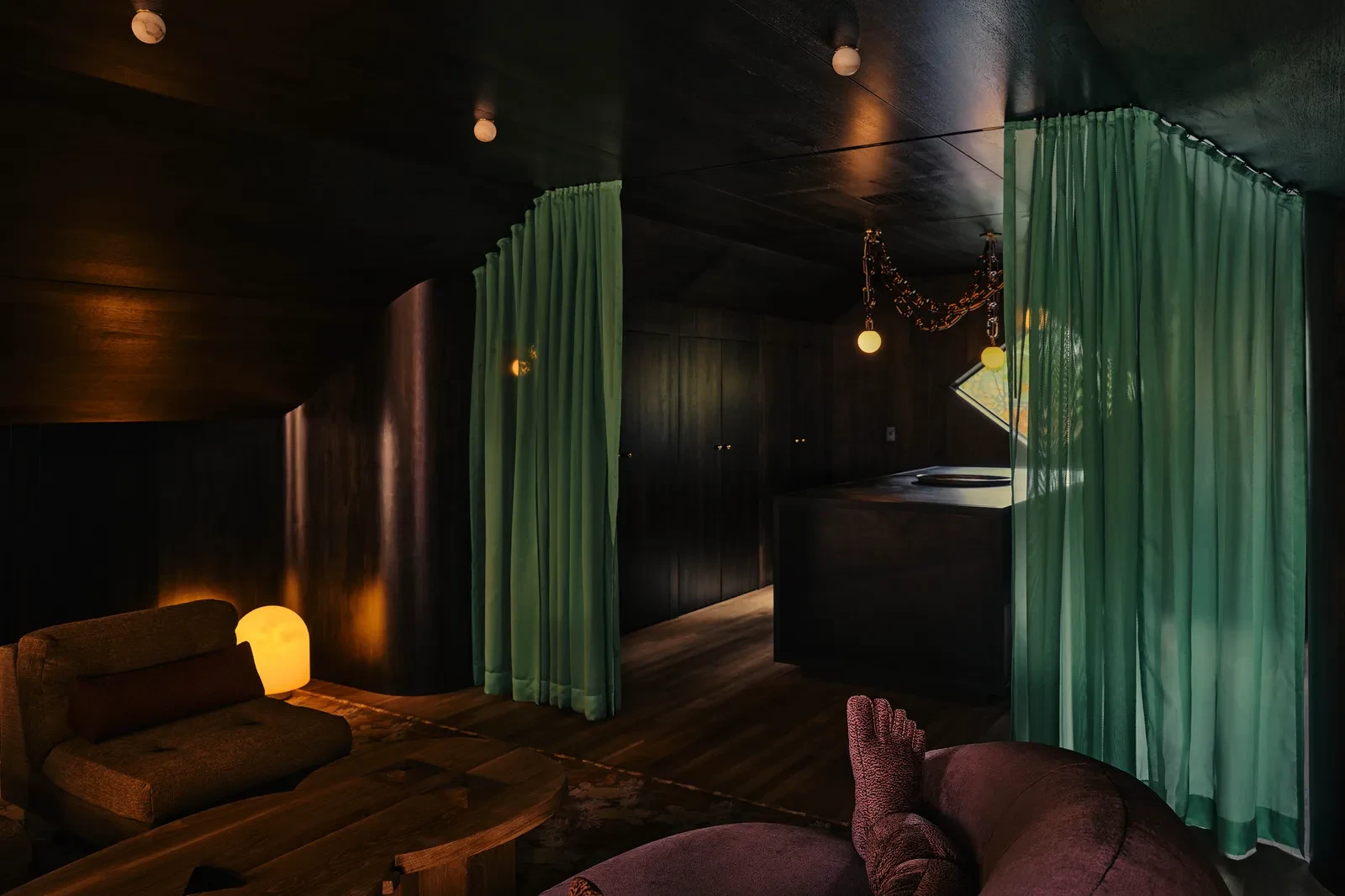 Πέρα από τους χώρους φιλοξενίας, το παλιό σχολείο διέθετε και ένα μεγάλο studio για τις καλλιτεχνικές εργασίες. Το συγκεκριμένο δωμάτιο μετατράπηκε σε αποθηκευτικό χώρο για καλλιτεχνικά υλικά και ντύθηκε με vintage έπιπλα, τα οποία δίνουν χαρακτήρα στον χώρο, όπως ένα παλιό μεταλλικό μπαούλο με ζωηρά διακοσμητικά μοτίβα. Επίσης, στο χαμηλότερο επίπεδο του κτιρίου δημιουργήθηκε ένας χώρος προβολών, όπου οι custom καναπέδες σε βαθιές αποχρώσεις του μωβ και τα μαξιλάρια δημιουργούν μια πιο σκοτεινή και κινηματογραφική ατμόσφαιρα.