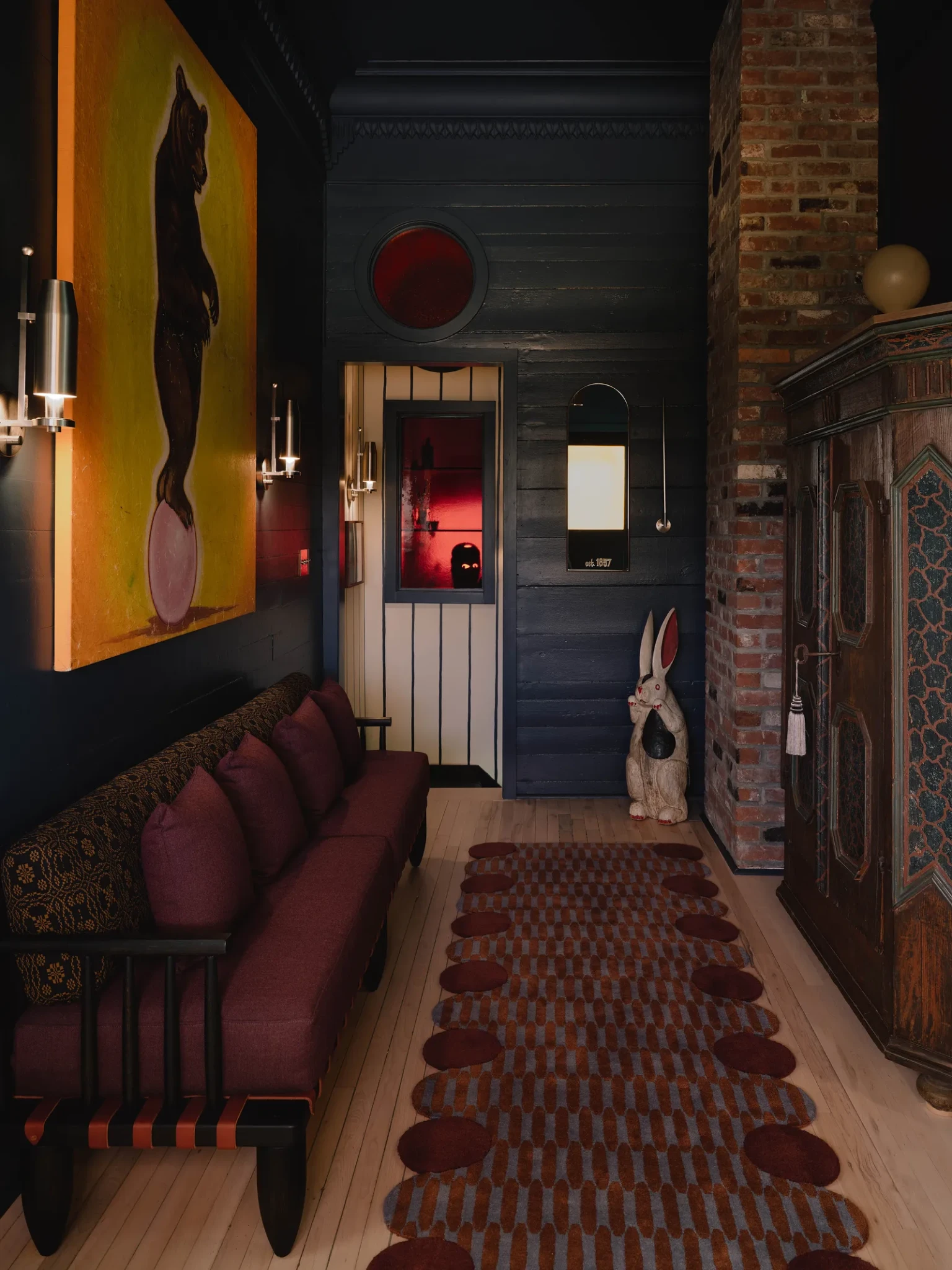 Το concept του εσωτερικού αντλεί έμπνευση από το πνεύμα ενός παλιού τσίρκου, όπου η διαφορετικότητα και η δημιουργικότητα βρίσκονται στο επίκεντρο. Αυτή η ιδέα διακρίνεται ήδη από την είσοδο, όπου μια vintage γλυπτική φιγούρα κουνελιού και ένας πίνακας με μια αρκούδα που ισορροπεί πάνω σε ροζ μπάλα δημιουργούν μια παιχνιδιάρικη πρώτη εντύπωση.