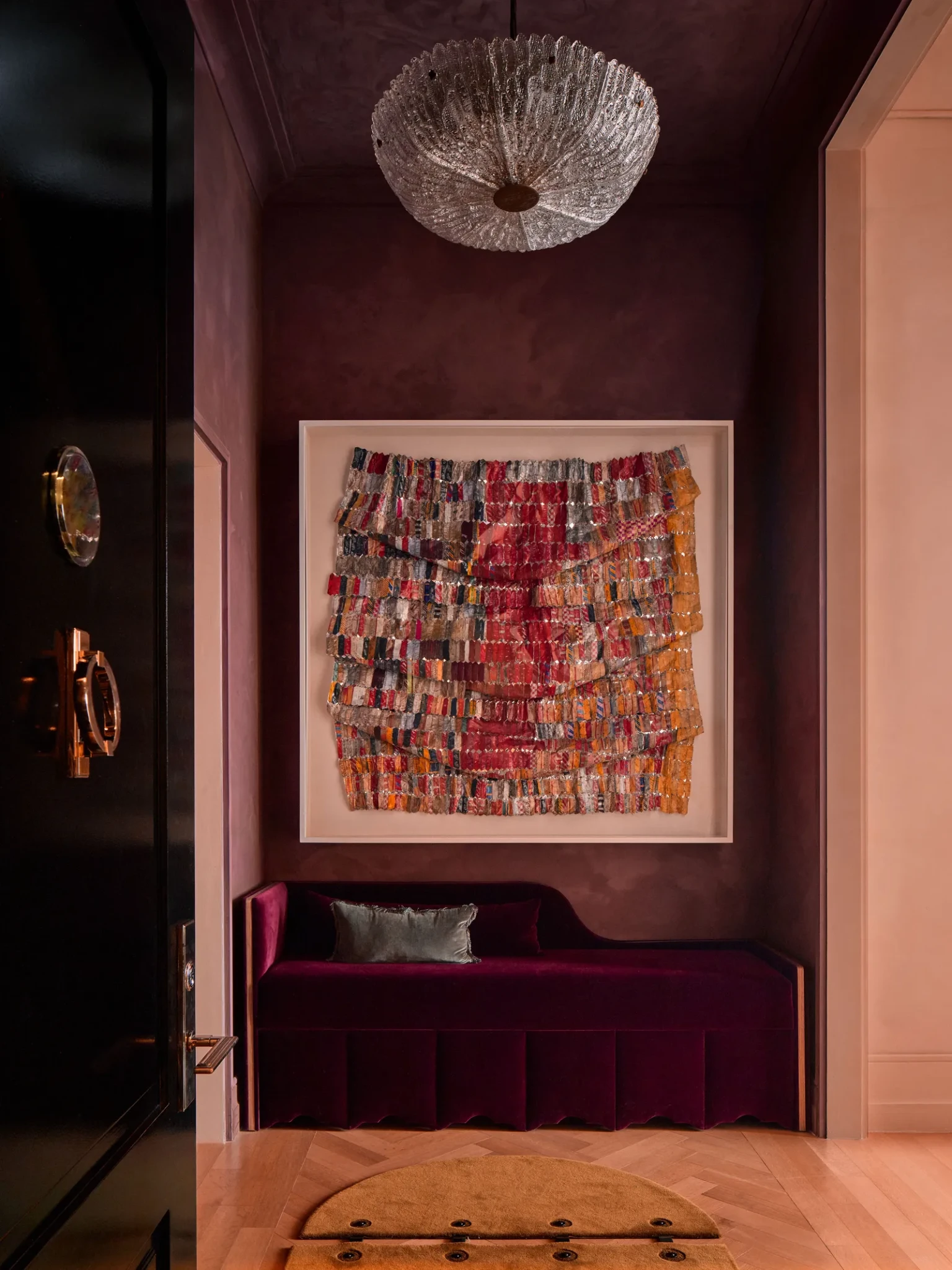 Ακόμη και η είσοδος του διαμερίσματος διαθέτει ένα bespoke παγκάκι από βελούδο και καρυδιά, το οποίο λειτουργεί ταυτόχρονα ως αποθηκευτικός χώρος για παπούτσια.