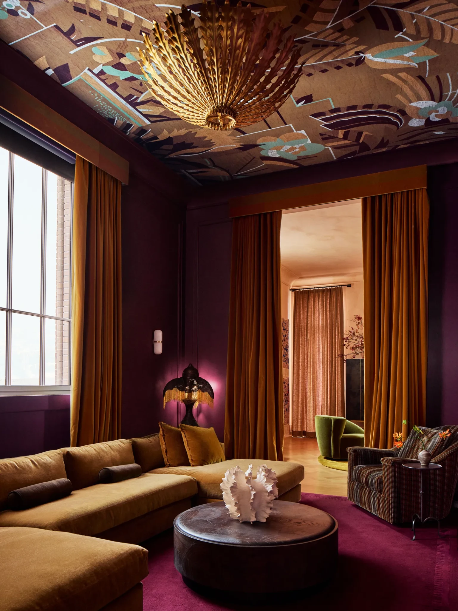Ένα home cinema αντί για τραπεζαρία Αντί για μια παραδοσιακή τραπεζαρία, το ζευγάρι επέλεξε να μετατρέψει τον χώρο σε αίθουσα προβολών. Το δωμάτιο έχει πιο σκοτεινή, ατμοσφαιρική παλέτα με βαθιές αποχρώσεις βατόμουρου και βαριές βελούδινες κουρτίνες, ενώ στην οροφή εμφανίζεται μια εντυπωσιακή ταπετσαρία της Schumacher με σχέδιο της Iksel. Ένας καναπές της Maiden Home και ένας πολυέλαιος της Visual Comfort & Co. για τη συλλογή της Aerin Lauder, δημιουργούν μια ατμόσφαιρα που θυμίζει κινηματογράφο. Το δωμάτιο έχει εξελιχθεί σε αγαπημένο σημείο του ζευγαριού για χαλαρές βραδιές με φίλους και μουσική.