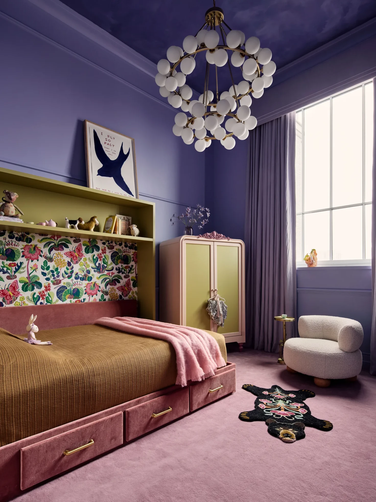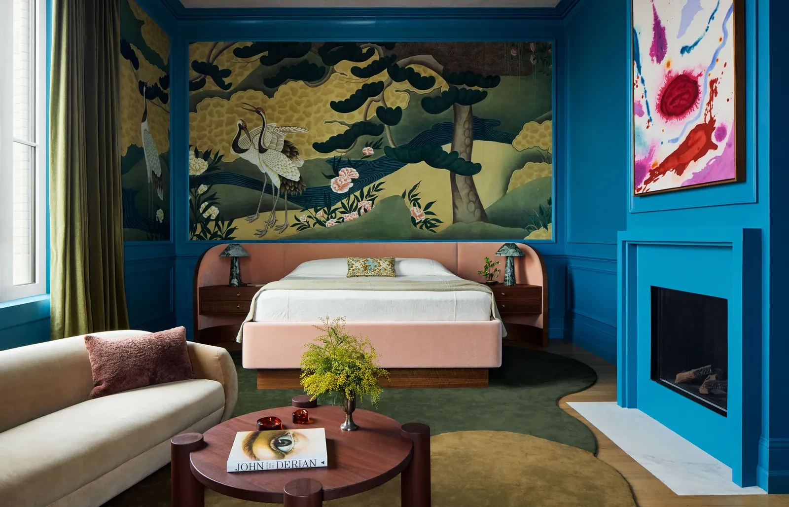 Στο κύριο υπνοδωμάτιο, οι τοίχοι ντύθηκαν με ταπετσαρία της Schumacher, ενώ οι ξύλινες επιφάνειες βάφτηκαν σε βαθύ μπλε τόνο που δημιουργεί μια πιο ήρεμη ατμόσφαιρα. Το υπνοδωμάτιο της κόρης τους έχει ντυθεί με μια τολμηρή μοβ απόχρωση και ένα custom κρεβάτι επενδεδυμένο με ύφασμα, ενώ σε άλλους χώρους εμφανίζονται προσωπικά έργα τέχνης και αναμνηστικά από την καριέρα της Upton.
