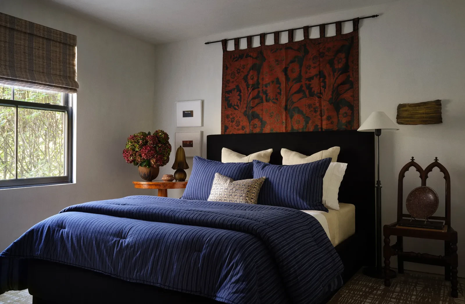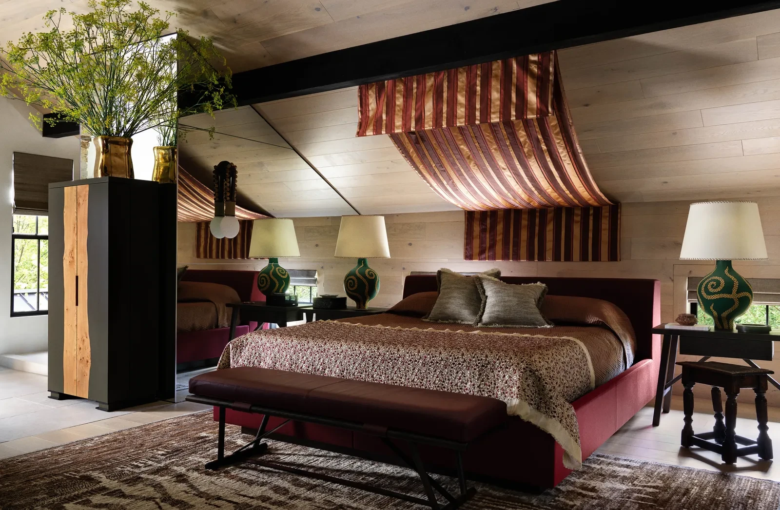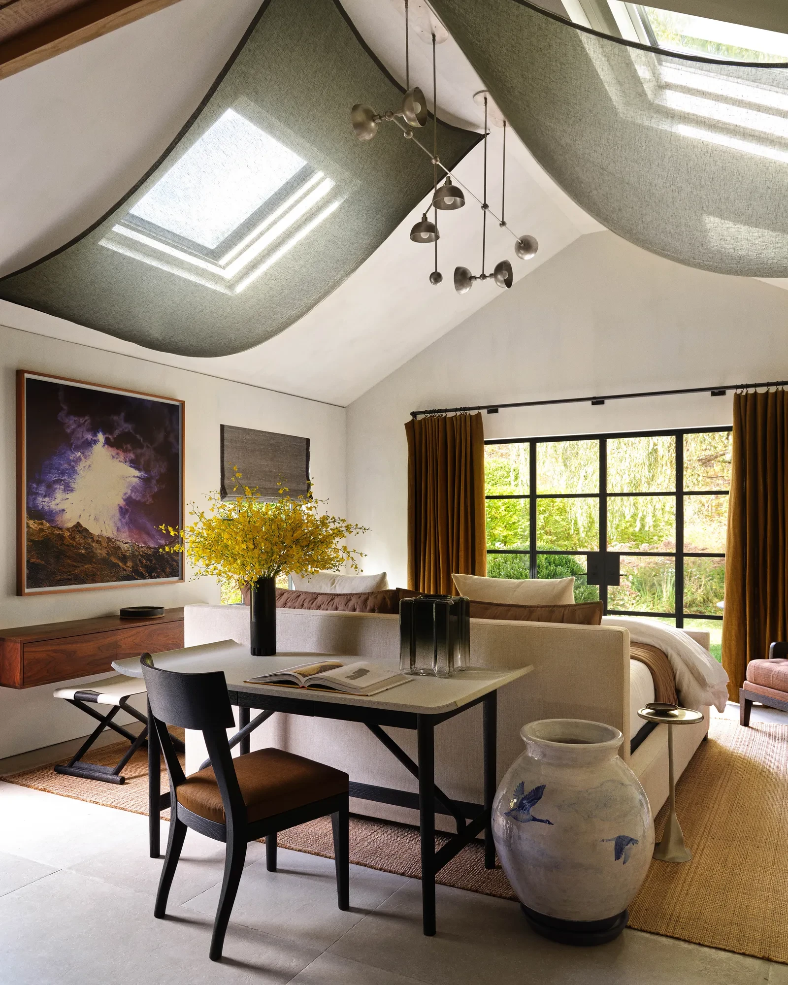 Στους ιδιωτικούς χώρους, η ατμόσφαιρα γίνεται ακόμη πιο ήρεμη. Τα υπνοδωμάτια σχεδιάστηκαν σαν προσωπικά καταφύγια, με έμφαση στην απλότητα και στην άνεση. Τα κεφαλάρια είναι ντυμένα με φυσικά υφάσματα, ενώ τα λευκά λινά και οι μάλλινες κουβέρτες δημιουργούν μια αίσθηση ζεστασιάς χωρίς περιττές υπερβολές. Τα κομοδίνα από παλαιωμένο ξύλο και τα κεραμικά φωτιστικά προσθέτουν χαρακτήρα, ενώ η περιορισμένη χρήση του χρώματος επιτρέπει στις υφές να πρωταγωνιστήσουν. Σε κάθε δωμάτιο, η επιλογή των αντικειμένων μοιάζει προσεκτικά μελετημένη, με στόχο να διατηρείται η αίσθηση ηρεμίας.