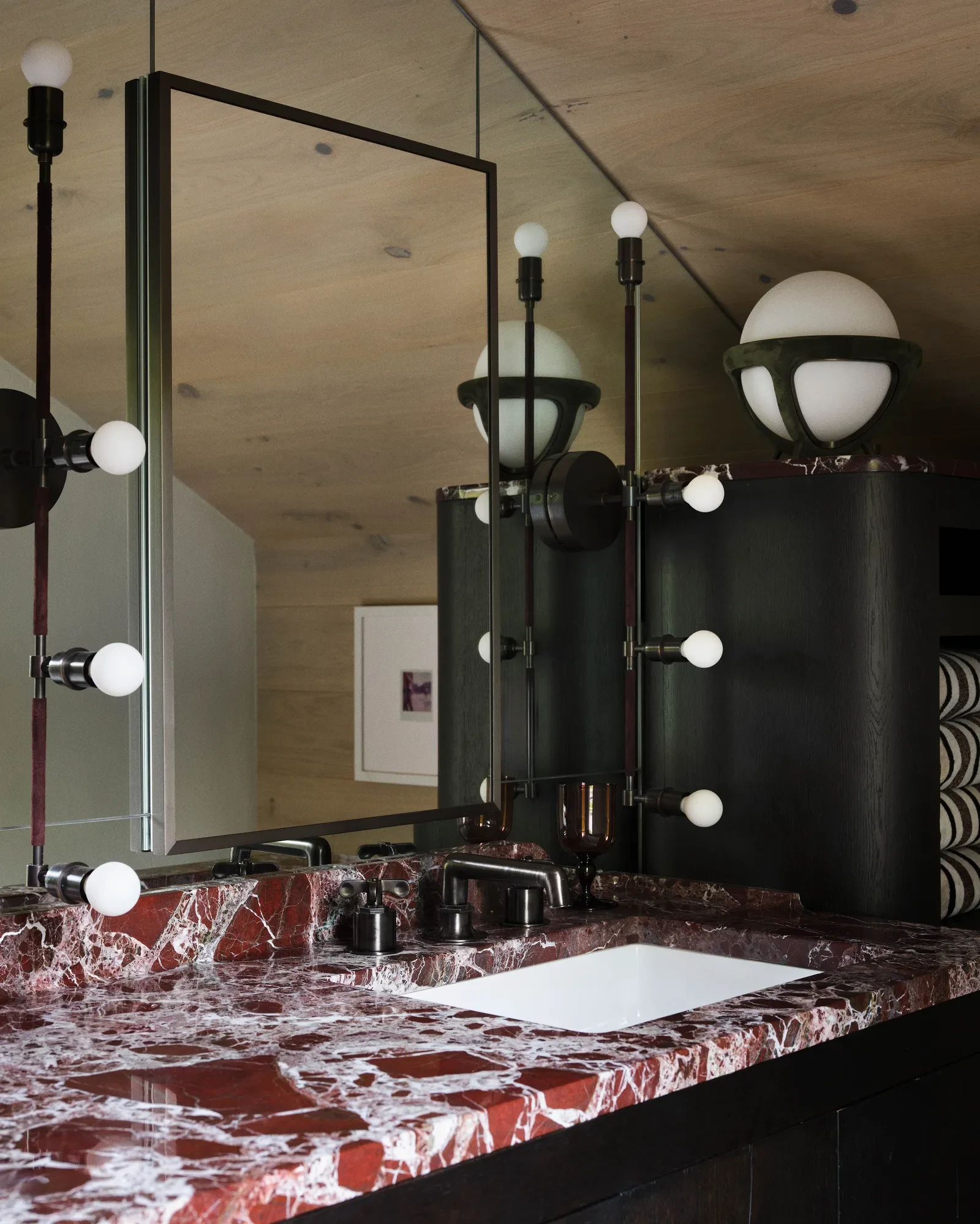Τα bespoke ξυλουργικά στοιχεία αποδεικνύουν τη σημασία της λεπτομέρειας, καθιστώντας το design του χώρου ως βαθιά προσωποποιημένο. Επιπλέον, ένα από τα στοιχεία που ξεχωρίζουν στο σπίτι είναι η χρήση συλλεκτικών επίπλων και χειροποίητων αντικειμένων. Αντί για μια πλήρως ομοιόμορφη αισθητική, ο σχεδιασμός βασίζεται στη συνύπαρξη διαφορετικών περιόδων και υφών.