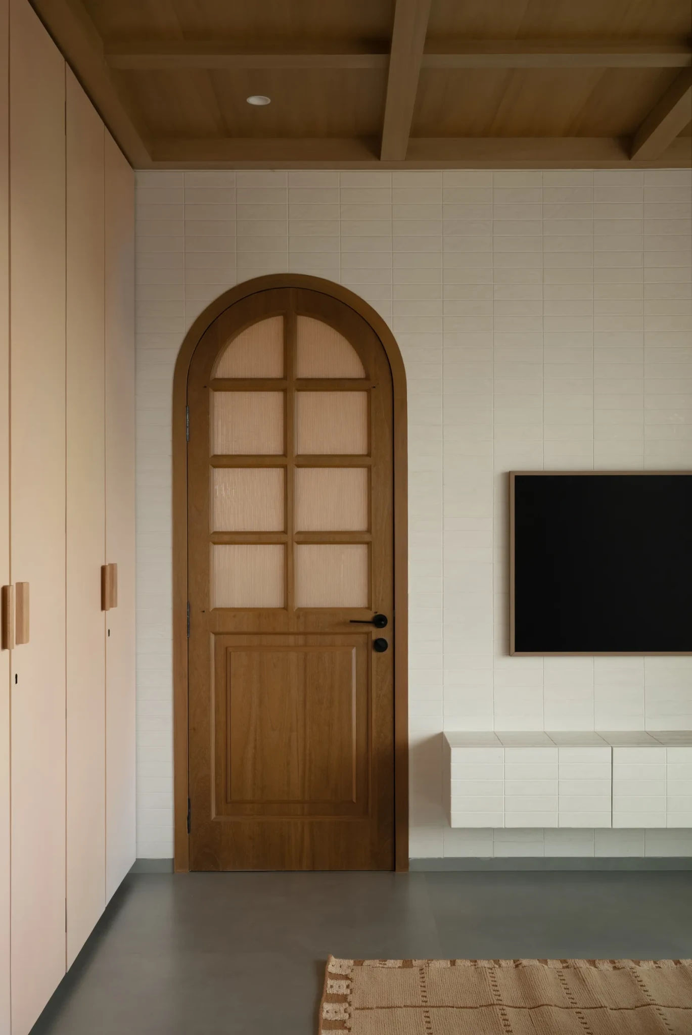 Στο παιδικό δωμάτιο το κρεβάτι αποτελεί το κεντρικό στοιχείο του χώρου, ενώ το ξύλινο ταβάνι και το καμπυλωτό παράθυρο πλαισιώνουν αρμονικά τη θέα στο δέντρο Champa. Το μπάνιο και ο πάγκος του ντύνονται από ροδακινί, ανάγλυφα πλακάκια και έρχονται σε αντίθεση με το υπόλοιπο σπίτι, ενώ η επιτοίχια λάμπα σε σχήμα καρδιάς θυμίζει σε σχεδιασμό και εναρμονίζεται με αυτό που βρίσκεται στο μπάνιο.