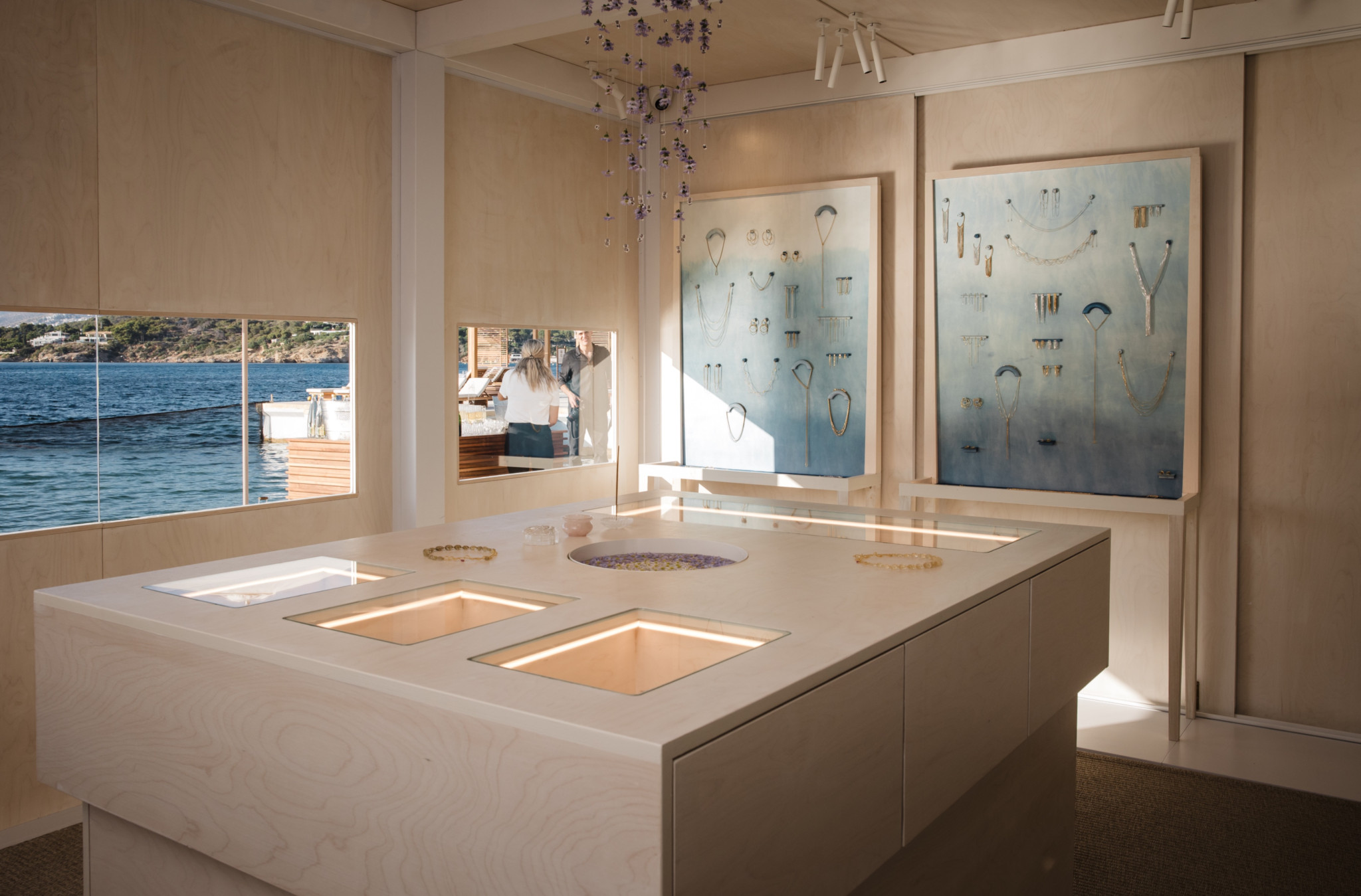 Το design υπογράφει ο Γιώργος Βογιατζάκης, ο οποίος δημιούργησε έναν διάλογο ανάμεσα στον επισκέπτη και τη θάλασσα, με πανοραμικά ανοίγματα που καδράρουν τη φανταστική θέα και αντανακλούν τους τόνους του μπλε στους εσωτερικούς τοίχους. Την αίσθηση συνέχειας και φυσικής ροής ενισχύουν τα μεταξωτά indigo υφάσματα από το Σουφλί, βαμμένα με φυσικές βαφές από τη master dyer Xριστιάνα Βαρδάκου, ενώ τα κοσμήματα εκτίθενται σε χειροποίητες κεραμικές βάσεις της designer Άννας Καρούντζου.