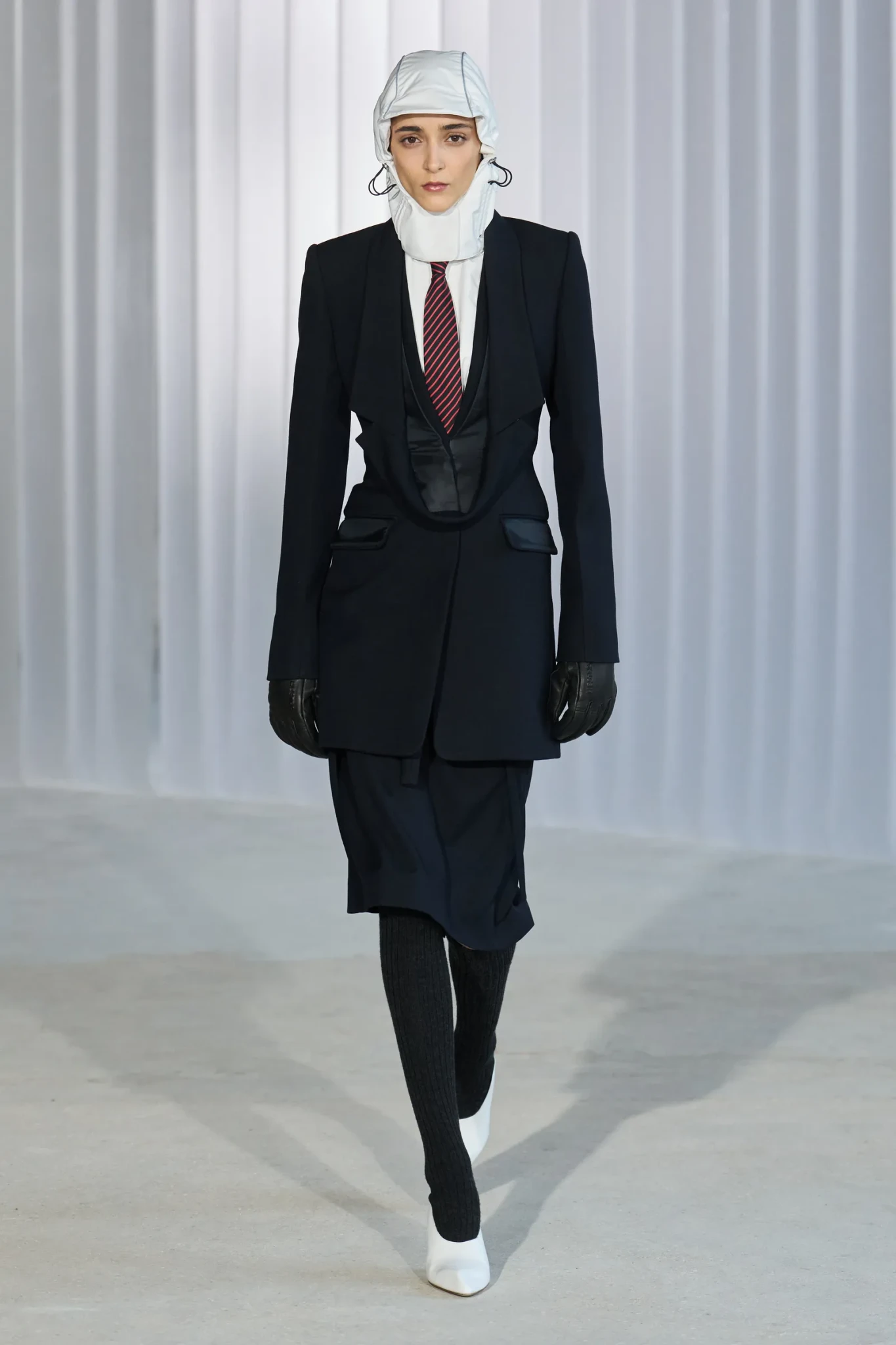 Η πασαρέλα ξεκίνησε με ένα μαύρο παλτό με έντονα τονισμένη μέση, το οποίο συνδεόταν με γιλέκο από μέσα, ενώ ακολούθησαν υβριδικά σύνολα που συνδύαζαν bomber jackets με φούστες, οι οποίες είχαν δημιουργηθεί από ανδρικά σακάκια. Το κλασικό pinstripe κοστούμι επαναπροσδιορίστηκε με δημιουργικό τρόπο, με γιακά που μετατρεπόταν σε bonnet και γραβάτα δεμένη κάτω από το πηγούνι.