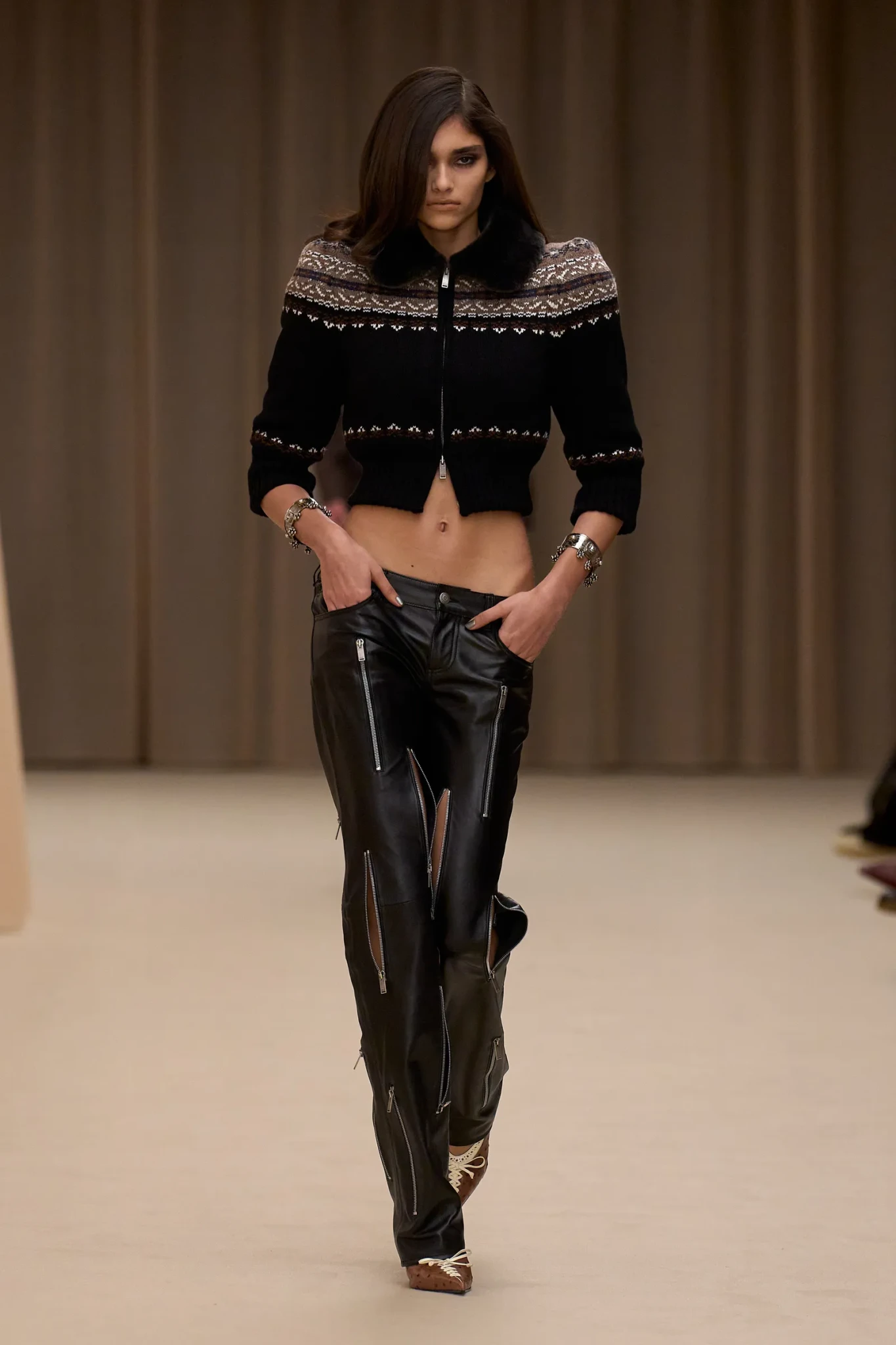 Στην πασαρέλα, η edgy κληρονομιά του οίκου συναντά μια πιο νεανική και σύγχρονη προσέγγιση. Δερμάτινα παντελόνια με φερμουάρ που ανοίγουν κατά μήκος των ποδιών και χαμηλή μέση θυμίζουν τα διάσημα “bumsters”, ενώ μίνι φούστες και knee-high boots δημιουργούν μια αισθητική που απευθύνεται ξεκάθαρα στη νέα γενιά. Η έμπνευση από τη Mary Quant γίνεται εμφανής μέσα από τις μίνι φούστες, οι οποίες επανεφευρίσκονται για το 2026 σε low waisted εκδοχές και oversized cargo τσέπες.