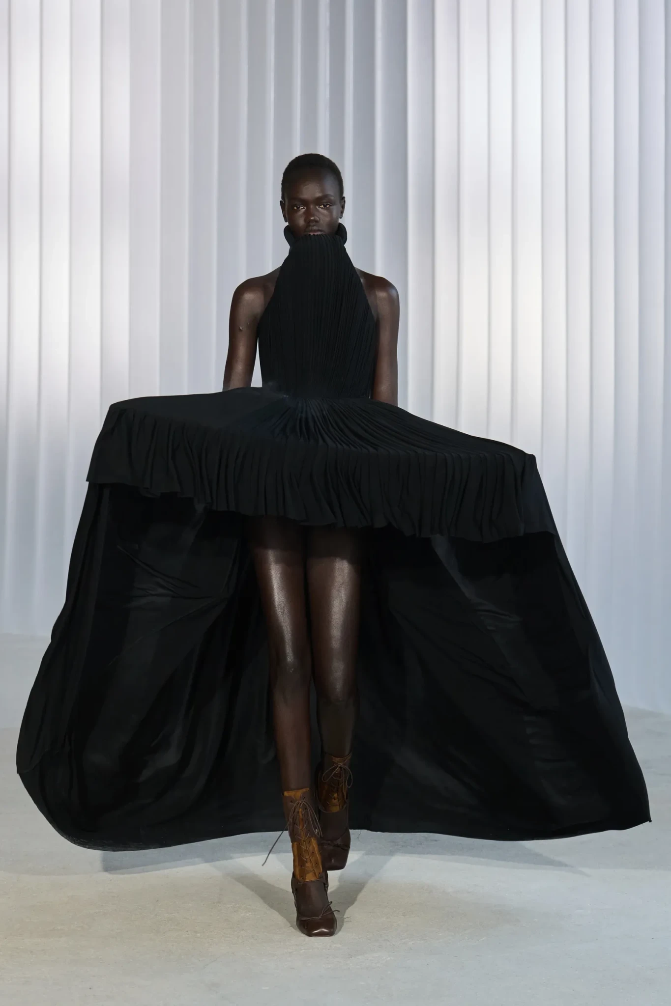 Το tailoring παραμένει εντυπωσιακό με σακάκια που κλείνουν με ένα μόνο hook κάτω από το στήθος, παραπέμποντας στη συλλογή La Poupée του 1997. Παράλληλα, εμφανίζονται στοιχεία από το ιστορικό Dante show του 1996, όπως το χαρακτηριστικό skeleton μοτίβο. Ξεχωρίζει ακόμη ένα χειροποίητο crocheted top με μεταλλικούς κρίκους και lurex νήμα – μια σύγχρονη εκδοχή chainmail που αποτυπώνει το δημιουργικό πνεύμα της ομάδας του οίκου.