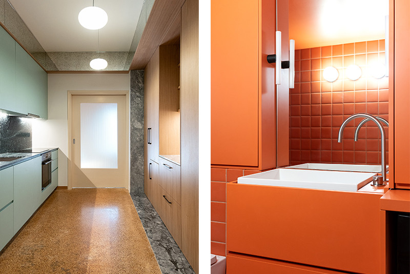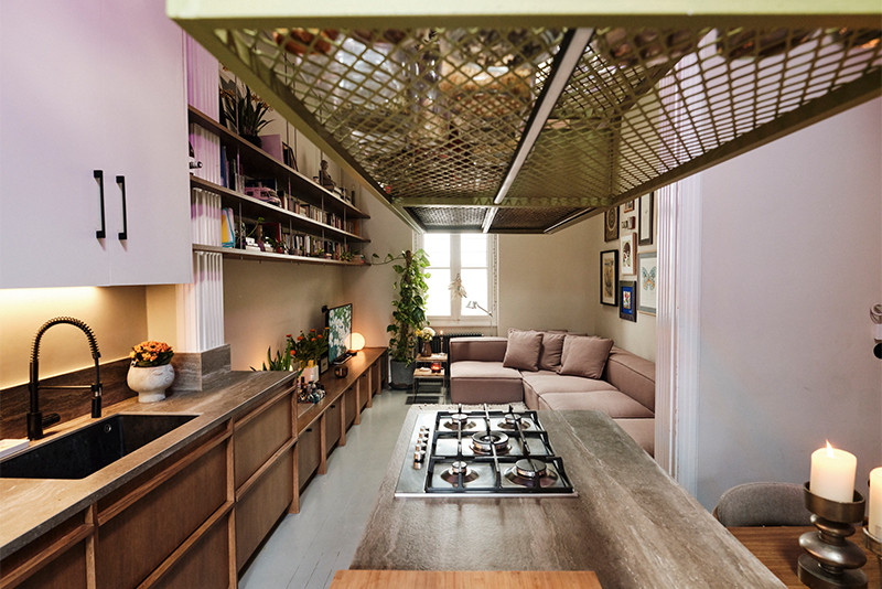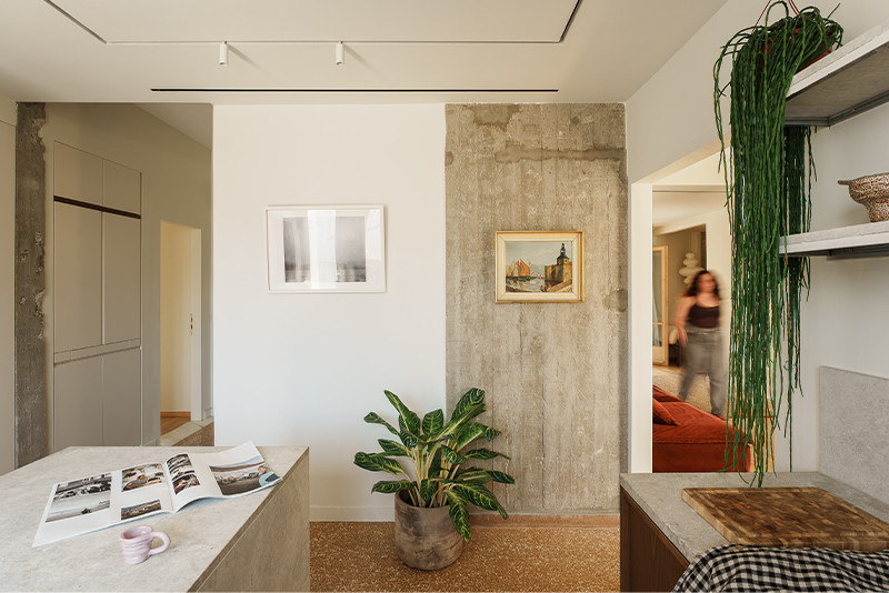Ένας διαμέρισμα του 1964 ανακαινίστηκε από τον αρχιτέκτονα Ricardo Alba, με βασική επιδίωξη τη διατήρηση του αρχικού του χαρακτήρα. Η κάτοψη αναδιαμορφώθηκε διακριτικά, μεταφέροντας την κουζίνα στον ευρύχωρο χώρο της εισόδου και επιτρέποντας τη δημιουργία ενός δεύτερου υπνοδωματίου. Ίχνη του παρελθόντος παραμένουν ορατά στο δάπεδο, όπου μάρμαρα Τήνου και Πάρνωνα «ράβουν» τον χώρο της παλιάς κουζίνας. Τα αρχικά ξύλινα πατώματα, τα κουφώματα και τα παντζούρια αποκαταστάθηκαν προσεκτικά, διατηρώντας την αυθεντική υπόσταση του διαμερίσματος. Το αποτέλεσμα είναι ένας ήπιος διάλογος ανάμεσα στην ιστορία του κτιρίου και το παρόν.