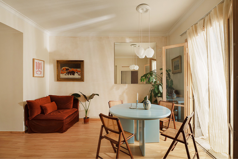 Η ανακαίνιση διαμερίσματος 115 τ.μ. στο Κολωνάκι, σε πολυκατοικία της δεκαετίας του 1950 ολοκληρώθηκε το 2025 από τους Plaini and Karahalios Architects και βασίζεται στη διατήρηση της αρχικής, πυκνά διαρθρωμένης κάτοψης. Η αρχιτεκτονική πρόθεση ήταν η ανάδειξη της υφιστάμενης χωρικής λογικής του διαμερίσματος, η χρωματική έμφαση του κάθε δωματίου και η δημιουργία ενός συνεκτικού αφηγήματος μέσα από τις ειδικές κατασκευές. Η αρχιτεκτονική επίλυση απαντάει στις σύγχρονες λειτουργικές ανάγκες, αναπλάθοντας τη μνήμη της αθηναϊκής κατοικίας της δεκαετίας του 1950.