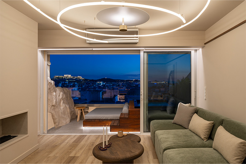 Ένα ρετιρέ διαμέρισμα στο κέντρο της Αθήνας ανακαινίζεται το 2023 από τους ArchZone, με βασικό ζητούμενο τον τονισμό και την ανάδειξη της θέας στην Ακρόπολη και στον Λυκαβηττό. Η αρχιτεκτονική πρόταση οργανώνεται γύρω από το φως ως βασικό χωρικό εργαλείο, το οποίο με τη μορφή «φωτοσωλήνα» χρησιμοποιείται για να δημιουργήσει οπτικές φυγές προς τη θέα, να προσδώσει ροή και να συνδέσει λειτουργικά τους χώρους.