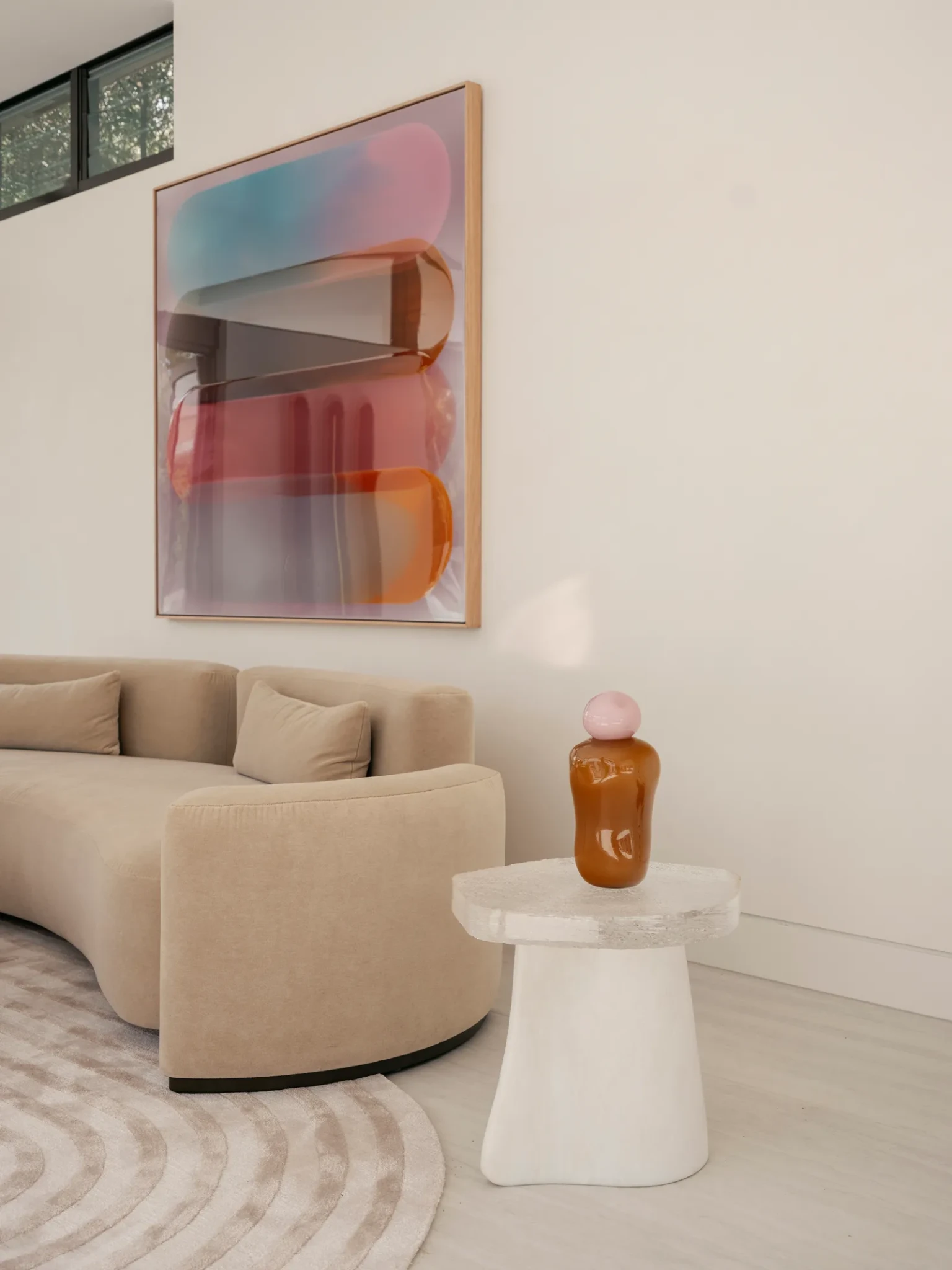 Η παλέτα του σπιτιού κινείται σε ήπιους, γήινους τόνους που δημιουργούν ένα ήρεμο και ισορροπημένο περιβάλλον. Ξύλο, πέτρα και φυσικά υφάσματα χρησιμοποιούνται σε όλο το σπίτι, προσδίδοντας υφή και αυθεντικότητα στον χώρο. Στο καθιστικό, οι καναπέδες σε ουδέτερες αποχρώσεις συνδυάζονται με ξύλινα τραπέζια και χειροποίητα αντικείμενα. Τα υλικά επιλέγονται όχι μόνο για την αισθητική τους, αλλά και για την αίσθηση που δημιουργούν στην αφή και στην καθημερινή χρήση. Η απουσία έντονων αντιθέσεων ενισχύει την αίσθηση ηρεμίας, επιτρέποντας στον χώρο να «αναπνέει».