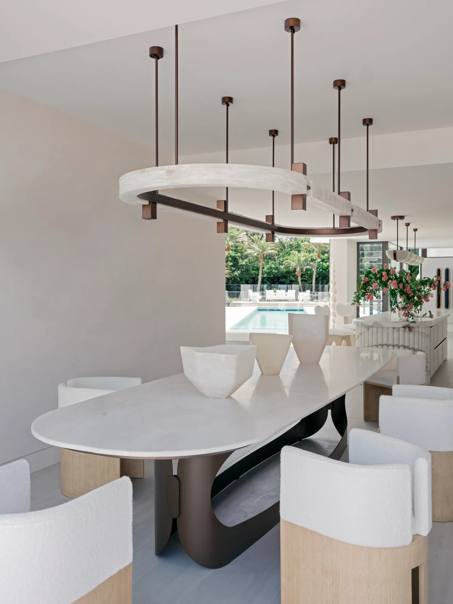Το καθιστικό, η τραπεζαρία και η κουζίνα συνδέονται σε έναν ενιαίο χώρο, όπου το βλέμμα κινείται ανεμπόδιστα προς τον εξωτερικό χώρο του σπιτιού και τη θάλασσα. Η μετάβαση από μέσα προς τα έξω γίνεται με τέτοιο τρόπο που προβάλλεται η σύνδεση με το φυσικό περιβάλλον. Η επιλογή των υλικών ενισχύει αυτή τη ροή, καθώς το ίδιο μοτίβο επαναλαμβάνεται τόσο στο εσωτερικό όσο και στο εξωτερικό του σπιτιού.
