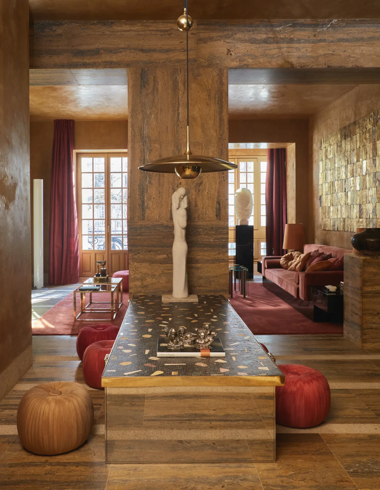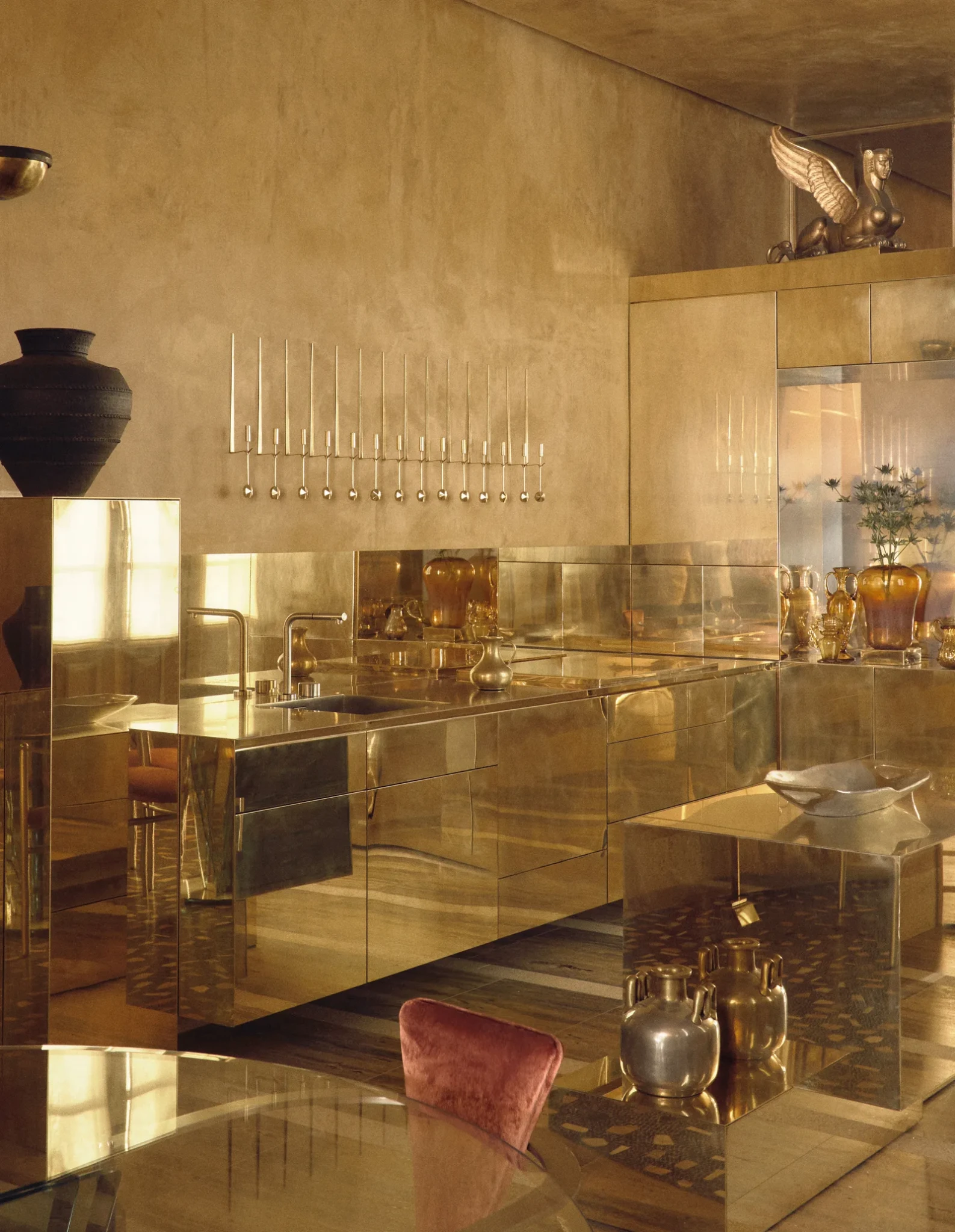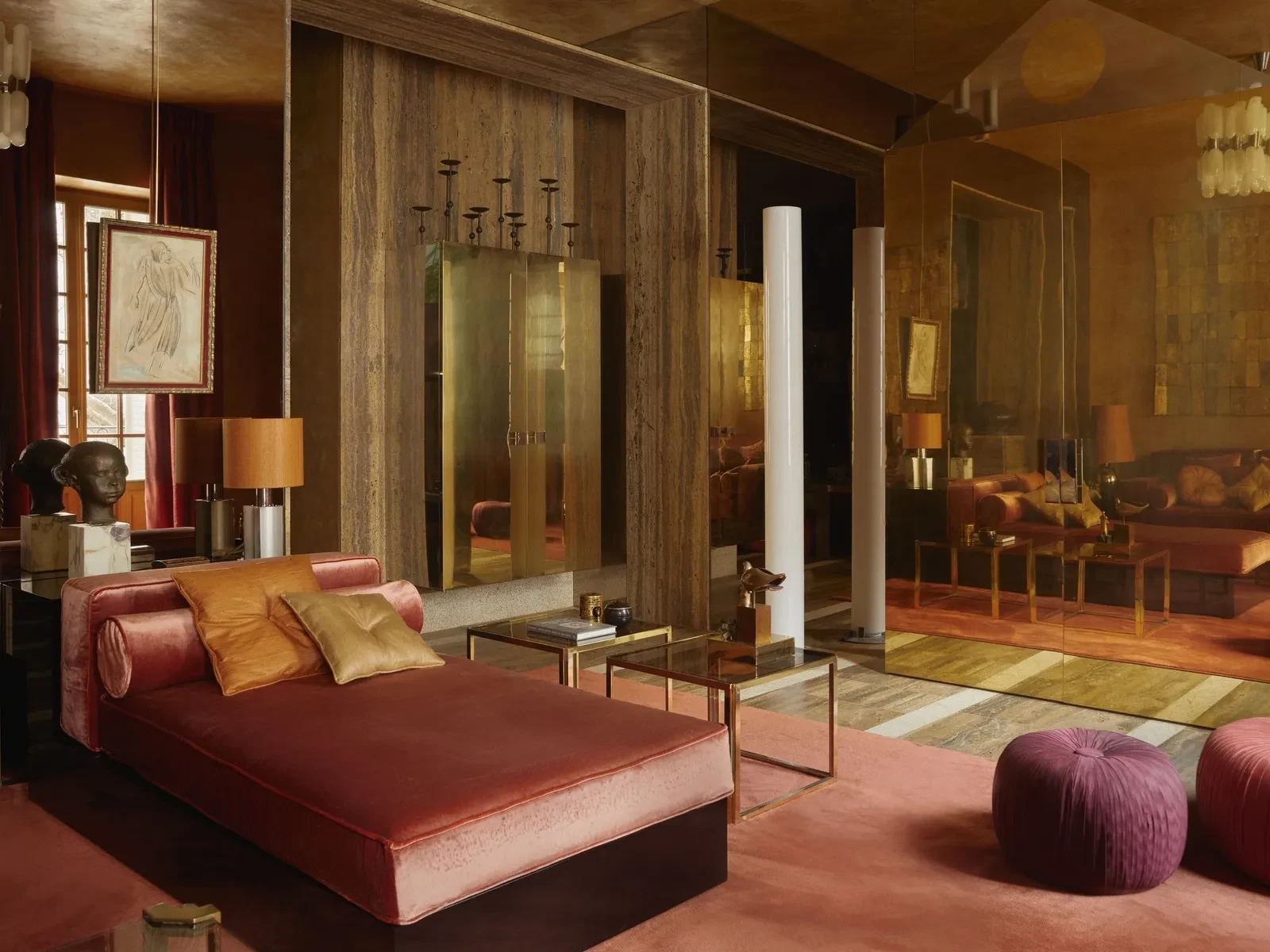 Αντίκες από το Παρίσι και τη νότια Γαλλία συνδυάζονται με σύγχρονα κομμάτια και έπιπλα που δημιουργήθηκαν αποκλειστικά για το διαμέρισμα. Τα υφάσματα, κυρίως ιταλικά μεταξωτά, μεταβάλλονται από κόκκινους και ροζ τόνους στους κοινωνικούς χώρους σε πράσινους, γκρι και ασημένιους στα υπνοδωμάτια, με τη συνέχεια να διατηρείται χάρη στις αντανακλαστικές επιφάνειες και τα χρυσά στοιχεία. Ο χρυσός και ο ασημένιος τόνος, σε συνδυασμό με ορείχαλκο, μπρούντζο και καθρέφτες, δημιουργούν μια σύνθεση που αναμιγνύει Art Déco, αισθητική των ’80s και αριστοκρατική κομψότητα.