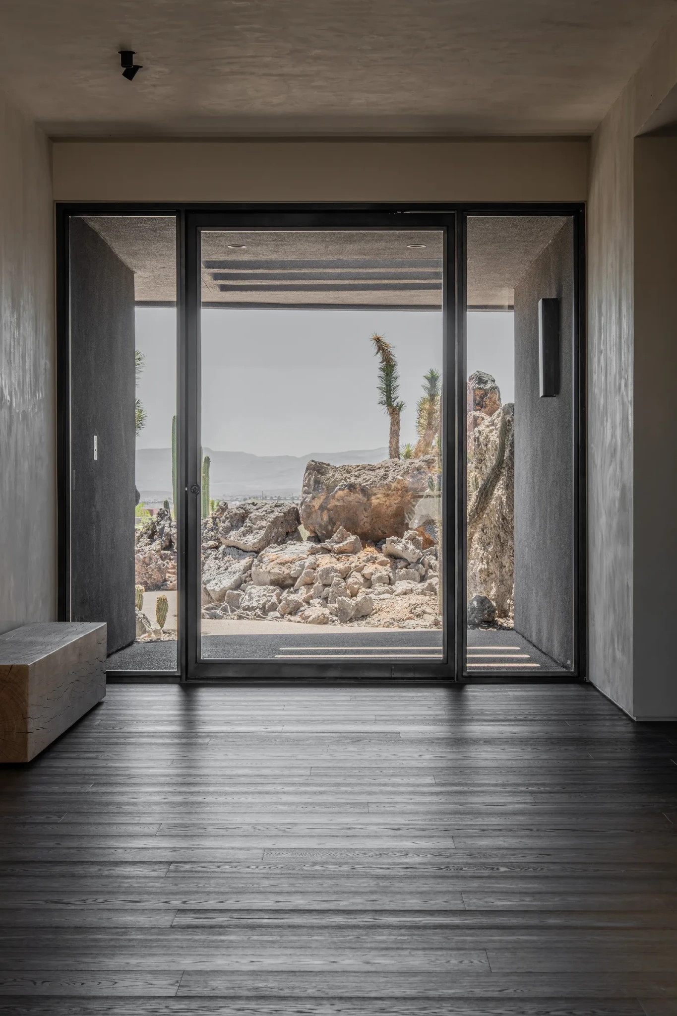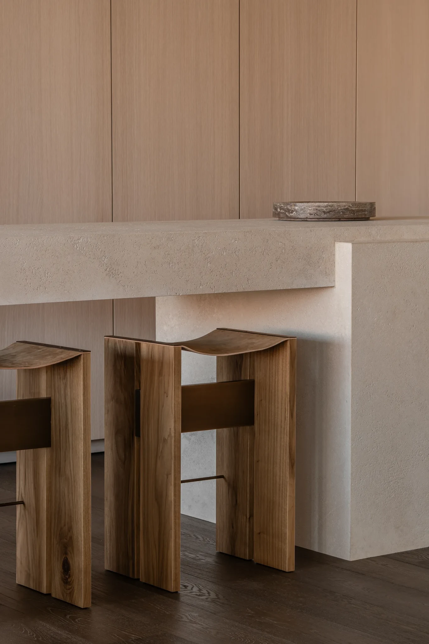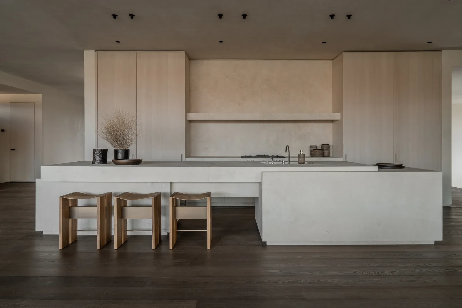 Σε πολλούς χώρους, η αίσθηση πλησιάζει μια γλυπτική εμπειρία παρά αρχιτεκτονική κατασκευή. Η πέτρινη νησίδα και οι λείοι πάγκοι στην κουζίνα μοιάζουν να έχουν “σμιλευτεί” από τη γη παρά να έχουν κατασκευαστεί στο χέρι. Οι τοίχοι στα υπνοδωμάτια είναι πλήρως ντυμένοι με μικροτσιμέντο και ενισχύουν μια ηρεμιστική, “σπηλαιώδη” ατμόσφαιρα.