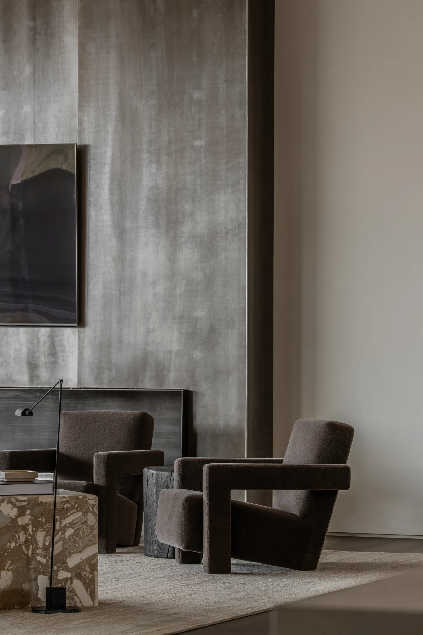 Το τραπέζι του πρωινού είναι vintage Tobia Scarpa και οι καρέκλες του προσθέτουν μια διαχρονική νότα, ενώ δίπλα, το τζάκι συνοδεύει ένα ζευγάρι Utrecht πολυθρόνες σχεδιασμένες από τον Gerrit Rietveld για την Cassina, κομμάτια που προσδίδουν χαρακτήρα και ισορροπία στο minimal περιβάλλον.
