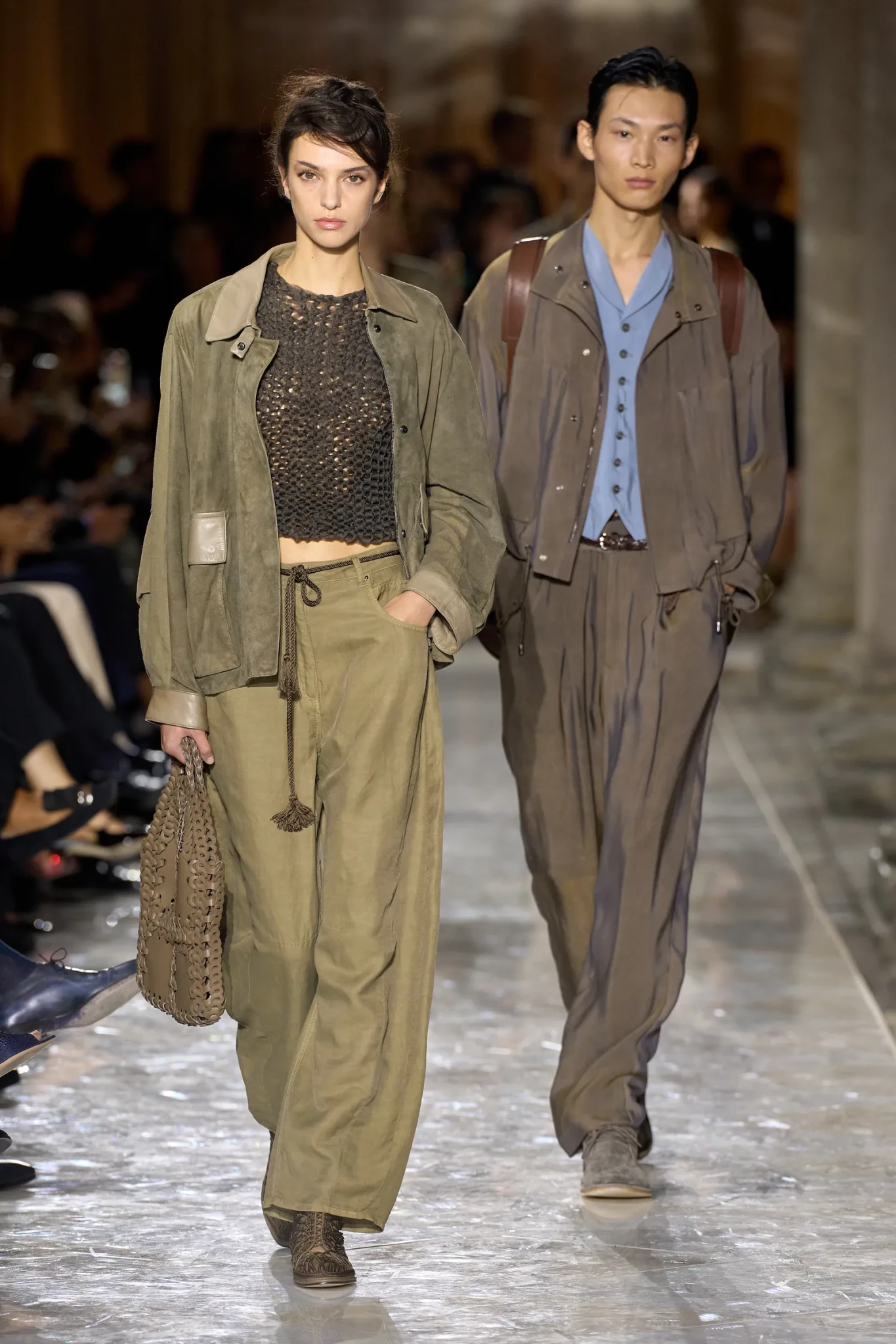 Η σιωπή του κοινού ενίσχυε αυτή την ατμόσφαιρα σεβασμού. Ακόμη και ο ήχος των υφασμάτων καθώς κινούνταν τα μοντέλα ακουγόταν καθαρά, σαν μέρος της παράστασης. Το σκηνικό ήταν σχεδόν λιτό, αλλά ακριβώς εκεί βρισκόταν η δύναμη της στιγμής. Σε μια εποχή όπου οι επιδείξεις μόδας συχνά μετατρέπονται σε θεάματα, ο ιταλικός οίκος με αυτήν την κίνηση υπενθύμισε ότι η ουσία θα βρίσκεται πάντα στα σχέδια και στις δημιουργίες.