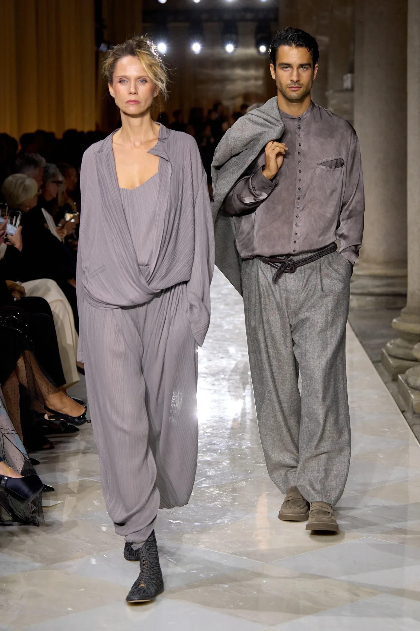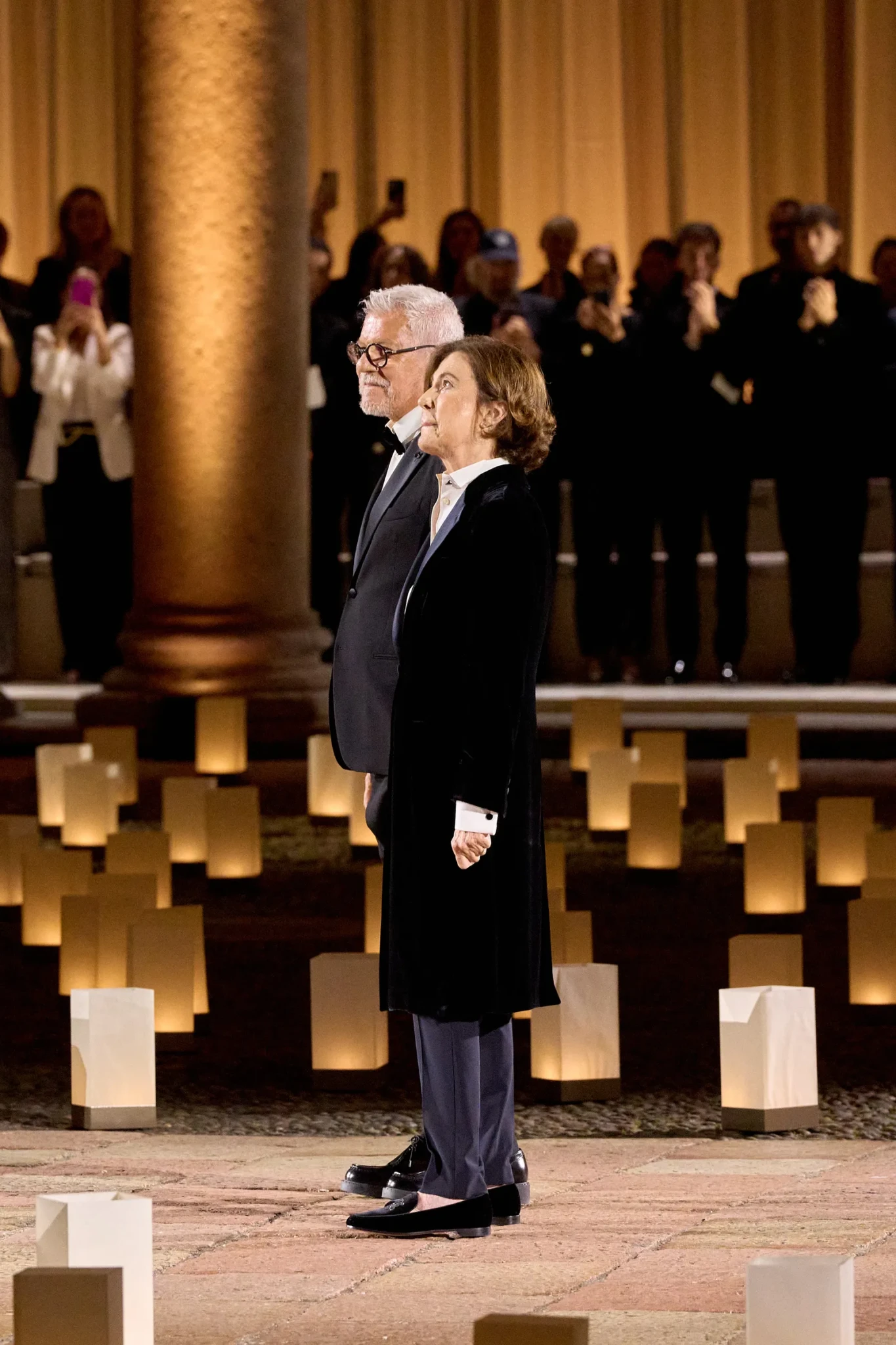 Στην τελική υπόκλιση, η Silvana Armani και ο Leo Dell’Orco, στενοί συνεργάτες και συνεχιστές της κληρονομιάς του οίκου, ανέβηκαν στη σκηνή. Ήταν μια στιγμή, η οποία συμβόλιζε τη μετάβαση.