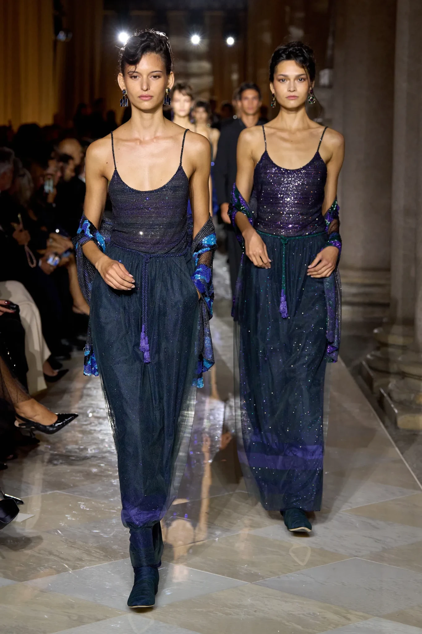 Η επιλογή της Brera ήταν συμβολική. Ο Armani πάντα έβλεπε τη μόδα σαν τέχνη που συνομιλεί με την πόλη του Μιλάνου και με τον πολιτισμό της. Ανάμεσα στις στοές και τις πέτρινες κολόνες, το πλακόστρωτο είχε επενδυθεί με ένα διακριτικό καρό μοτίβο, που θύμιζε θεατρικό σκηνικό. Τα φώτα ήταν χαμηλά, τόνιζαν τις σκιές, ενώ ο Ludovico Einaudi συνόδευε ζωντανά στο πιάνο, χαρίζοντας μια μελωδική γέφυρα ανάμεσα στο παρελθόν και το παρόν.