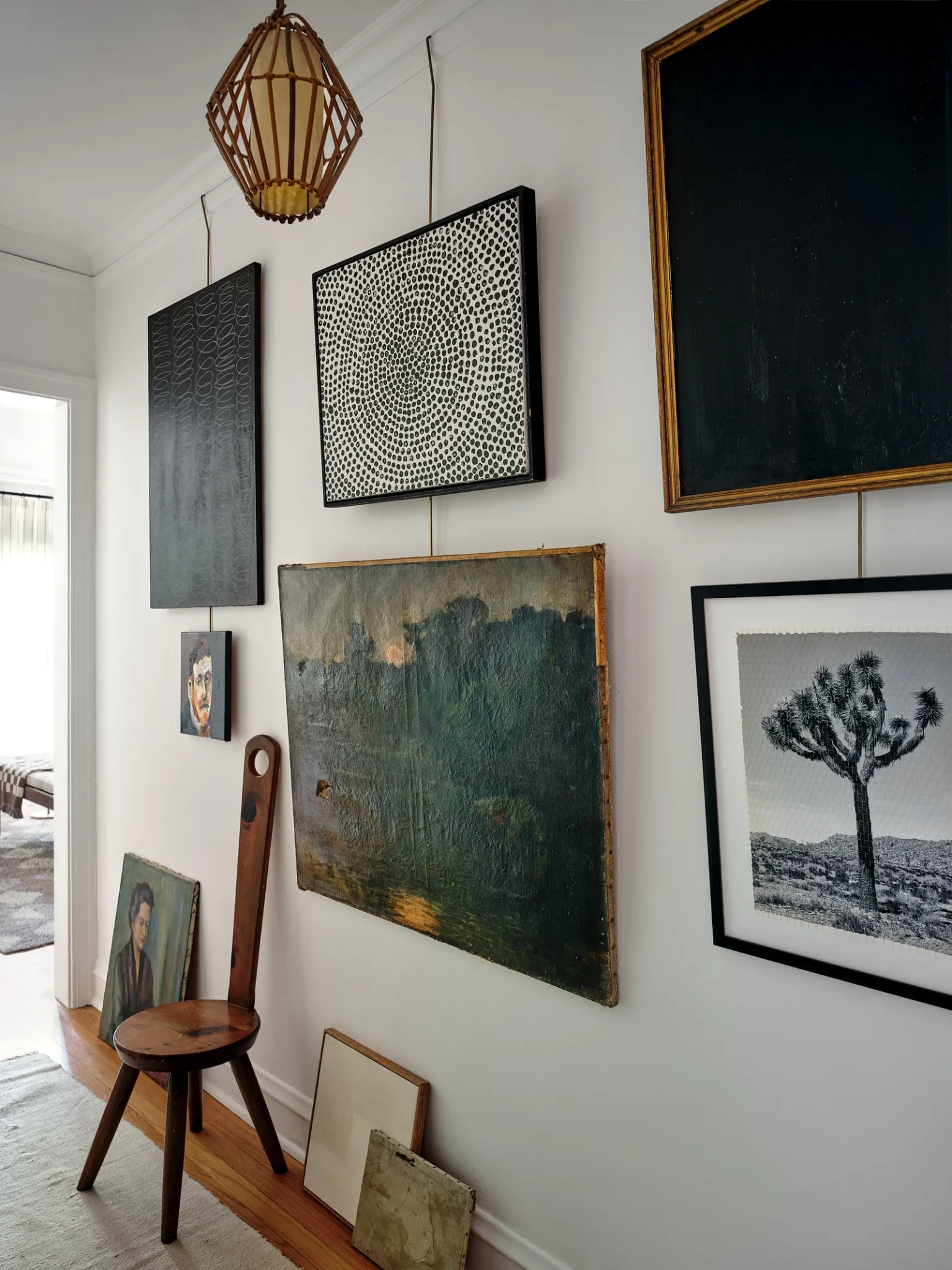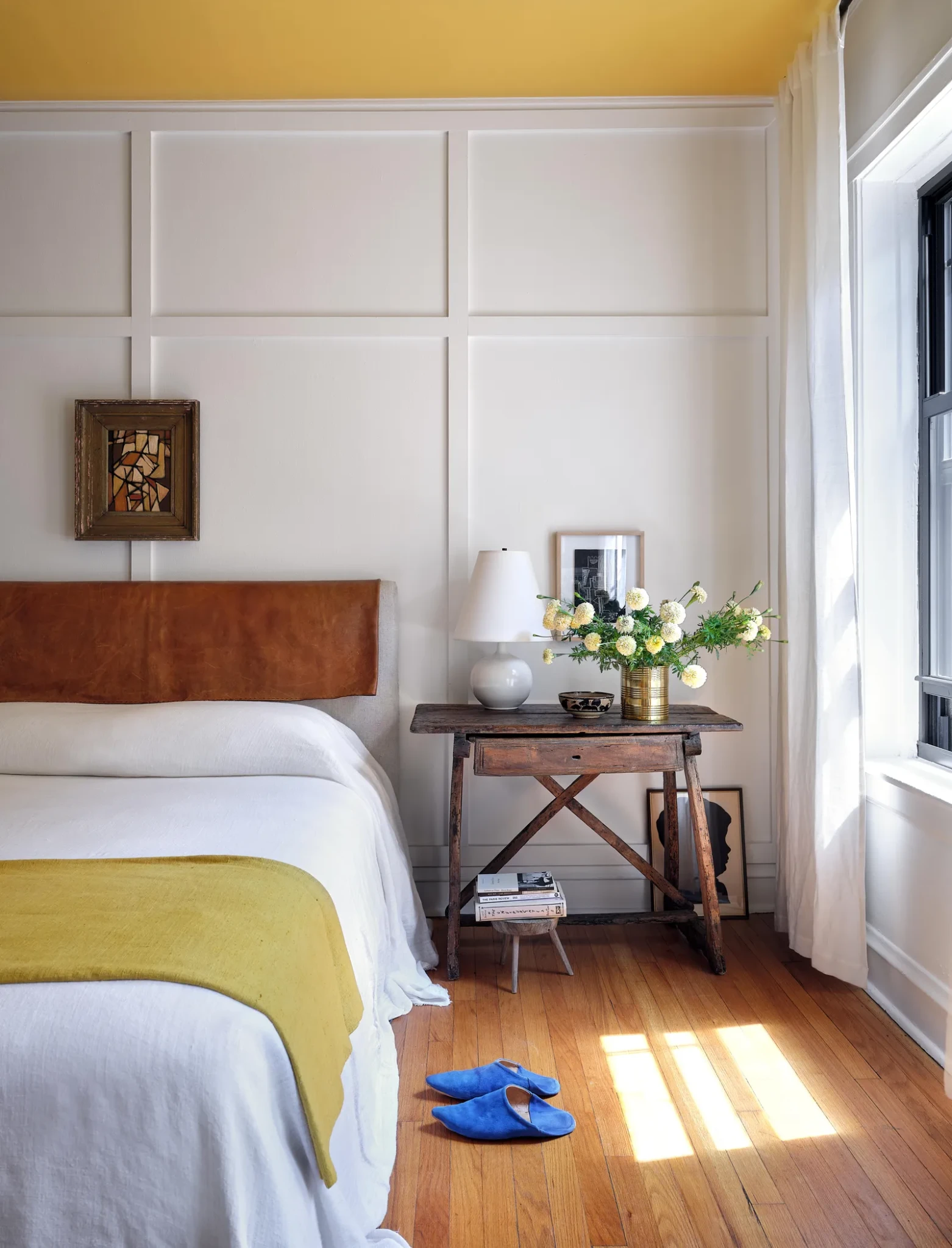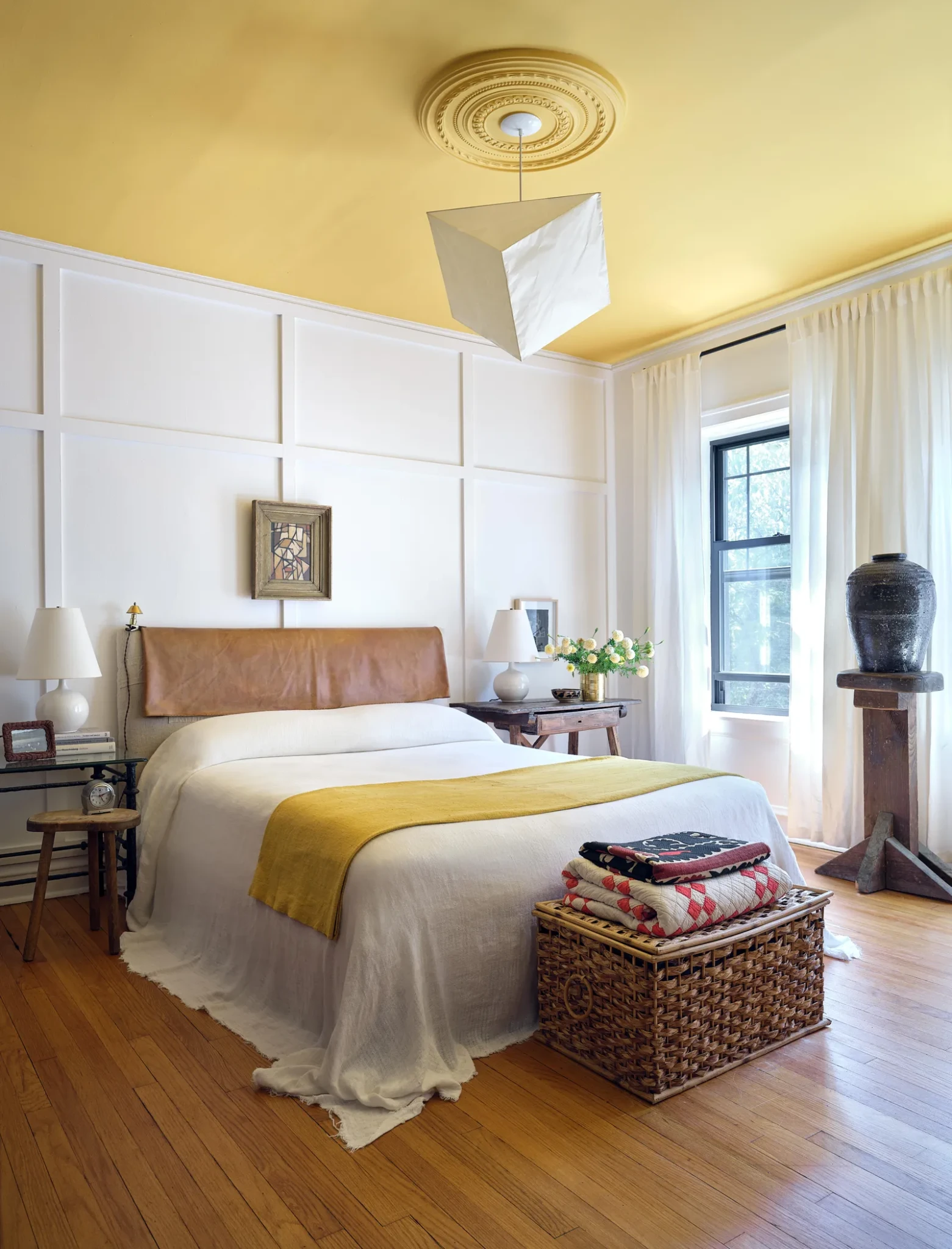 Στο υπνοδωμάτιο, το σκηνικό αλλάζει. Μια λάμπα Noguchi απλώνει απαλό φως κάτω από οροφή βαμμένη σε ζωηρό κίτρινο, επιλογή εμπνευσμένη από ταξίδι στο Μαρόκο. Το χρώμα γίνεται αναφορά στην εμπειρία, στην περιπέτεια, στο ταξίδι που διαμορφώνει τη ματιά του συλλέκτη.