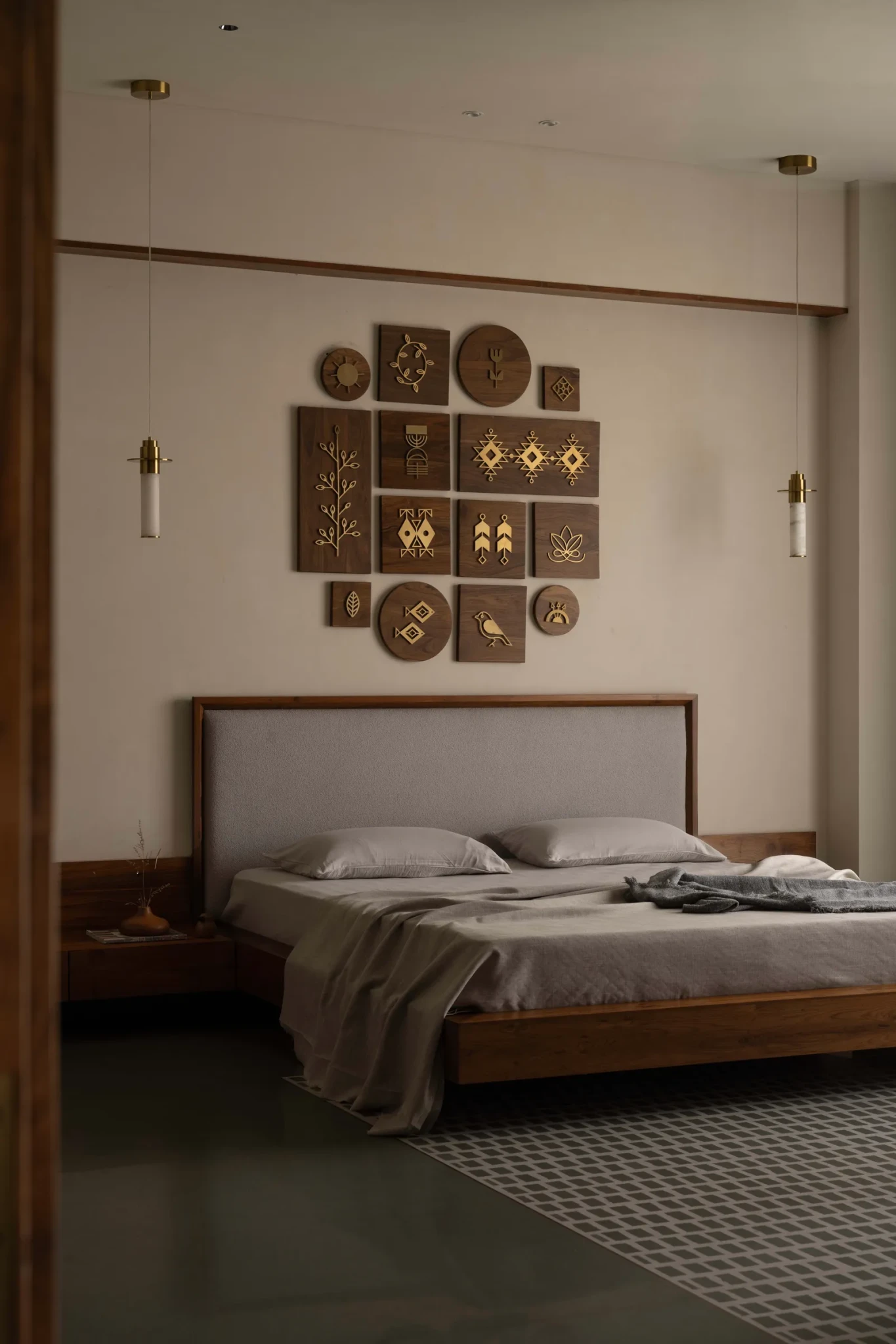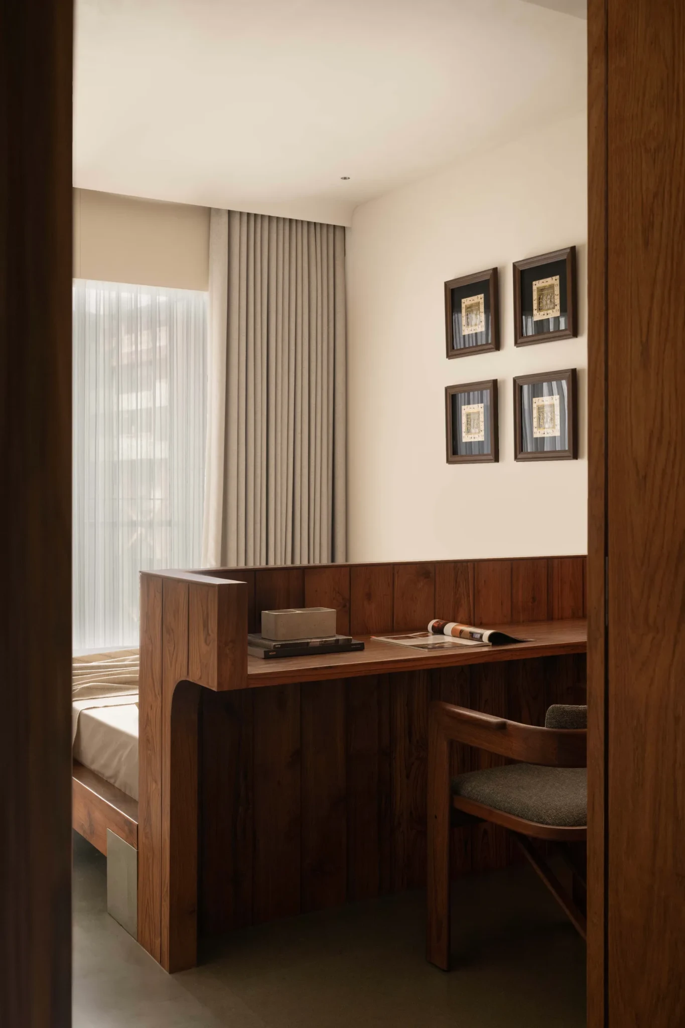 Στον πυρήνα του σπιτιού βρίσκεται ο χώρος της κουζίνας και της τραπεζαρίας, που λειτουργεί ως σημείο συγκέντρωσης. Στην Gujarati κουλτούρα, το φαγητό αποτελεί βασικό στοιχείο φιλοξενίας, και αυτό αποτυπώνεται ξεκάθαρα στον σχεδιασμό. Η κουζίνα είναι ανοιχτή και συνδέεται άμεσα με την τραπεζαρία, επιτρέποντας την αδιάκοπη επικοινωνία μεταξύ των μελών της οικογένειας και των επισκεπτών. Η διάταξη αυτή διευκολύνει τη ροή και ενισχύει την αίσθηση της κοινότητας μέσα στο σπίτι. Τα έπιπλα παραμένουν λειτουργικά και διακριτικά, με ξύλινες επιφάνειες και καθαρές γραμμές που εξυπηρετούν την καθημερινότητα χωρίς περιττές διακοσμήσεις.