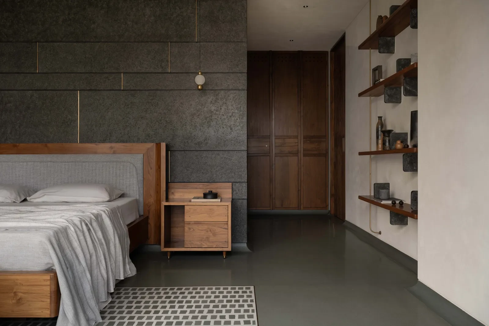 Η φιλοσοφία του «material honesty» αποτελεί βασικό στοιχείο του design. Αντί για πολυτελή, γυαλιστερά φινιρίσματα, επιλέχθηκαν υλικά που ανταποκρίνονται στο κλίμα και στον τρόπο ζωής των κατοίκων. Οι τοίχοι καλύπτονται με lime plaster, που συμβάλλει στη ρύθμιση της θερμοκρασίας, ενώ τα δάπεδα διατηρούνται δροσερά ακόμα και στις υψηλές θερμοκρασίες της περιοχής. Η πέτρα κυριαρχεί σε όλο το σπίτι, με επιφάνειες όπως οι τοίχοι και τα δάπεδα να αποκτούν μια φυσική, ήρεμη υφή. Παράλληλα, το ξύλο και οι διακριτικές μπρούτζινες λεπτομέρειες προσθέτουν ζεστασιά και ισορροπία. Ιδιαίτερο ενδιαφέρον παρουσιάζουν τα δάπεδα με τα ένθετα μοτίβα πέτρας, που θυμίζουν σύγχρονα terrazzo «χαλιά», προσφέροντας ρυθμό και οπτική συνέχεια στον χώρο.