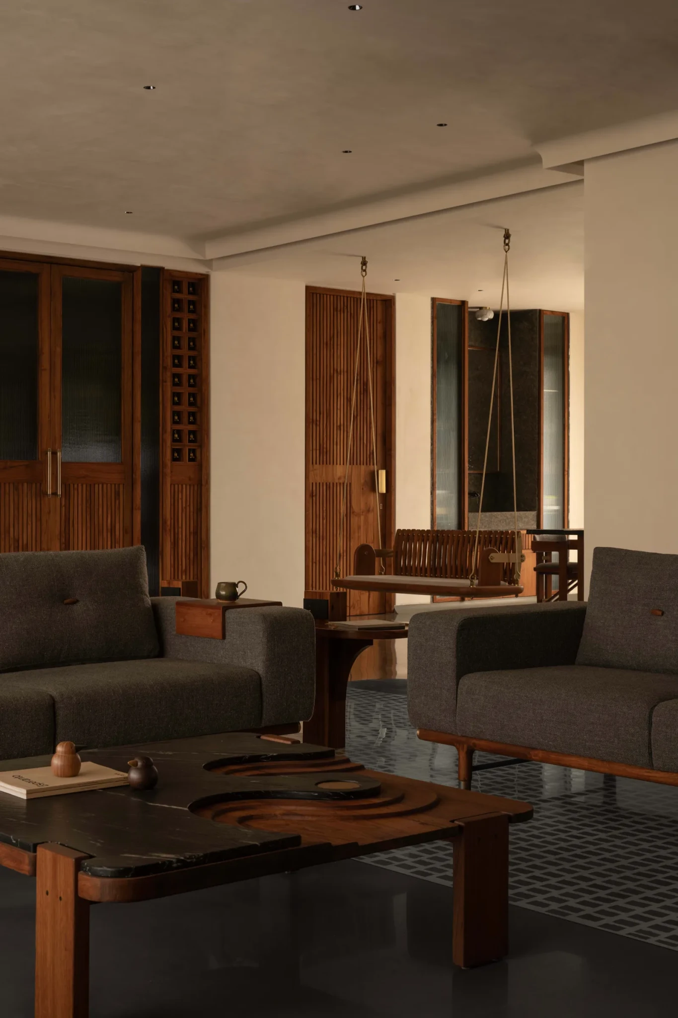 Οι χώροι καθιστικού διαχωρίζονται διακριτικά σε πιο επίσημους και μη, ανταποκρινόμενοι στις διαφορετικές ανάγκες της καθημερινότητας. Η διάκριση αυτή επιτρέπει τόσο τη φιλοξενία όσο και την ιδιωτικότητα. Ένα από τα πιο χαρακτηριστικά στοιχεία είναι οι παραδοσιακές κούνιες (hichkos), που είναι τοποθετημένες στο μπαλκόνι και κοντά στην τραπεζαρία. Αυτές λειτουργούν ως σημεία χαλάρωσης και κοινωνικής αλληλεπίδρασης, μεταφέροντας την εμπειρία της αυλής στο αστικό περιβάλλον. Τα έπιπλα είναι λιτά, με έμφαση στην άνεση και τη λειτουργικότητα, ενώ οι υφές παραμένουν φυσικές και ανεπιτήδευτες.